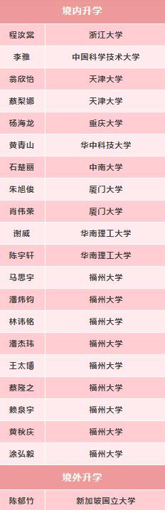 班级同学前往新加坡国立大学、浙江大学、天津大学、华中科技大学等院校深造,境内100%升学双一流学校,实现升学数量质量的双优。同学们不仅积极学习课本上的知识,从进入大学以来,大家就充分利用课余时间学习课本外的知识,积极进入实验室开展实验,获省级以上化工类竞赛8人次,成果申请专利2项。
