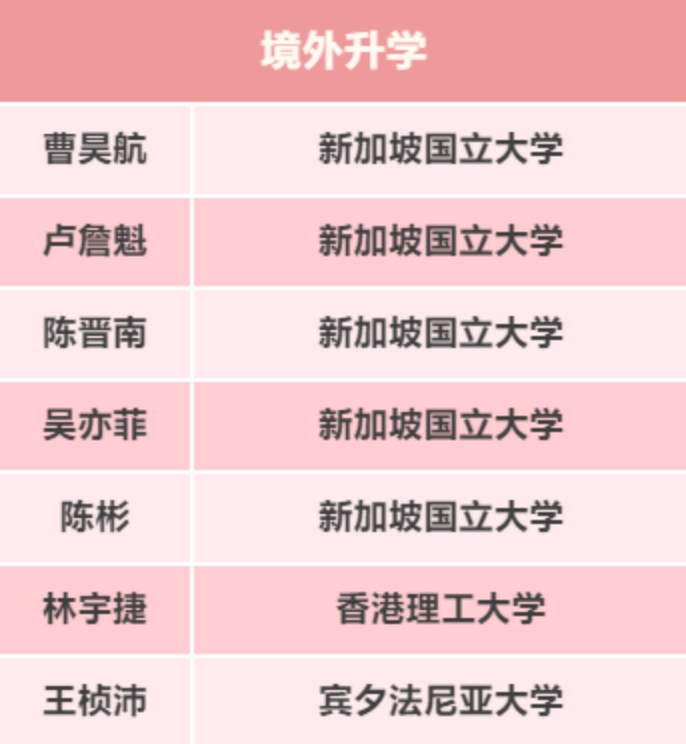 考研升学捷报频传。截至目前,130人成功获得国内外高校硕士研究生攻读资格,本科生整体升学率超55%。其中,化学工程与工艺4班升学率达74.1%,化学工程与工艺1班升学率达70.0%,化学工程与工艺5班升学率达67.9%。另外,还有这些班级升学率超过了50%,过程装备与控制工程2班升学率达60.7%,化学工程与工艺2班升学率达55.6%,化学工程与工艺3班升学率达53.6%,油气储运工程1班升学率达50%。境内升学包括天津大学、浙江大学、上海交通大学等一流大学;境外升学包括新加坡国立大学、宾夕法尼亚大学、曼彻斯特大学等名校。