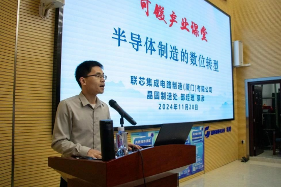 泉港楼由优尔报告厅举办,联芯集成电路制造(厦门)有限公司晶圆制造处部经理蔡彦先生为同学们带来了《半导体制造的数位转型》的主题分享,本次活动由学院团委副书记何杰老师主持。