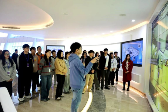 在厦门联芯,同学们走在公司文化长廊,通过文化墙和座座奖杯,直观感受企业联芯从初创到逐步壮大的发展轨迹。随后,通过企业宣传视频以及人力资源处主管的进一步介绍,详细了解了公司的发展历程、工艺技术、产品应用以及未来规划。接着,研学导师晶圆制造处经理徐光以最新产业成果的实物展览与产业一线的虚拟生产相结合的形式带领同学们远程观看芯片制造的实时生产环境,让同学们对半导体行业最新的产业技术和智能化制造有了更深层次的理解。