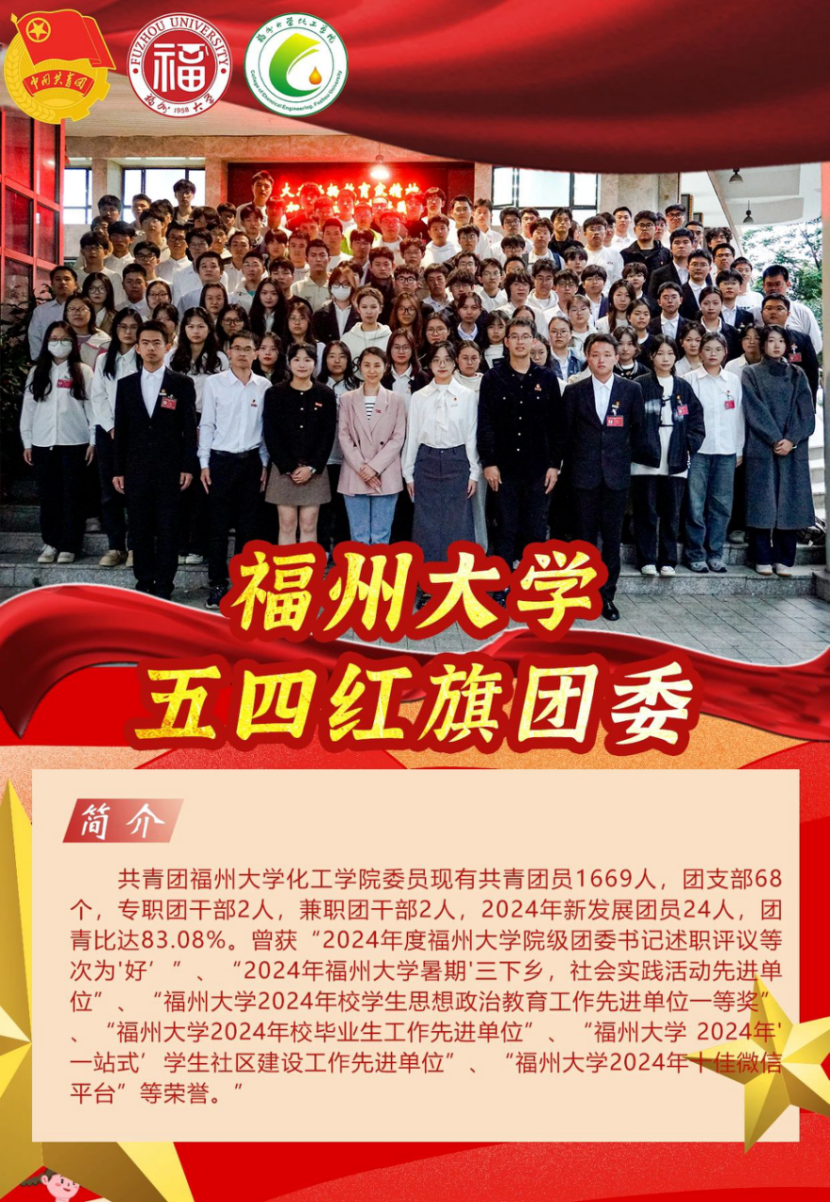 牵头组建5栋楼宇兼合式团支部,凝聚楼宇团员青年;落实“推优”工作机制,2024年发展团员24人,向党组织推荐入党积极分子157人、党的发展对象63人。2个团支部获得校级团支部立项,2024级化工2班团支部进入“十佳团立项”决赛。