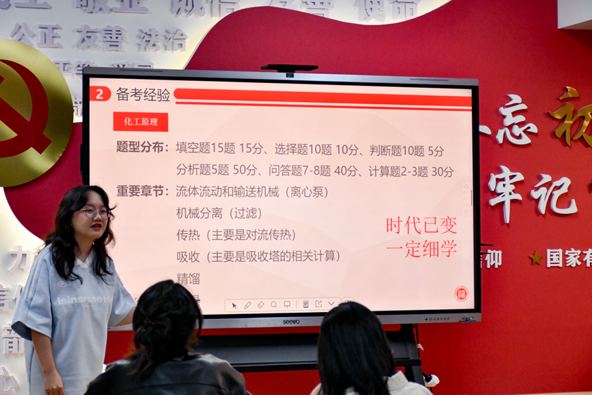 (三)洪珊妮学姐建议同学们合理规划备考时间,数学二注重基础阶段尽早启动、强化阶段构建知识框架,英语一坚持单词背诵与阅读训练贯穿全程,政治选择题注重多练多总结、主观题后期聚焦肖四,化工原理重视核心章节(如流体流动、传热、吸收等)的概念理解与题型训练,物理化学复试需兼顾计算与概念复习。其中最为关键的是,保持高效学习节奏,避免盲目堆积时长,同时以良好心态应对备考压力,适时调整状态以提升复习质量。