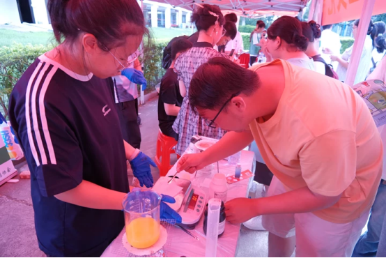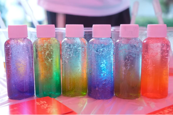 “海洋瓶”制作区,同学们把瑰丽色彩与创作喜悦一同封入瓶中,静置片刻,便能将一捧“迷你海洋”捧在手心。