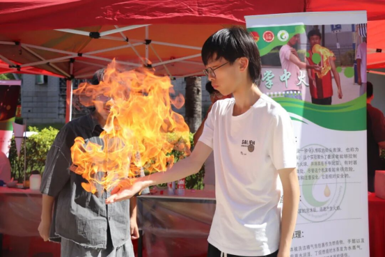 “掌中火”实验现场,同学们借助泡沫储存丁烷气体,亲手完成“掌上生火”——当炙热火焰在掌心瞬间绽放,又安全熄灭时,大家纷纷为化工的神奇魅力发出惊叹。