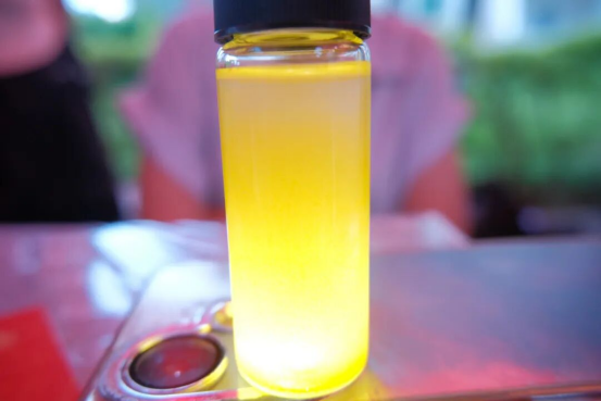 “黄金雨”实验前围满了人,溶液中析出的金黄小颗粒缓缓飘落,时而聚成小团、时而散作细屑,像一场温柔洒落的“金色细雨”,落在杯底闪着微光,同学们的惊呼声此起彼伏。