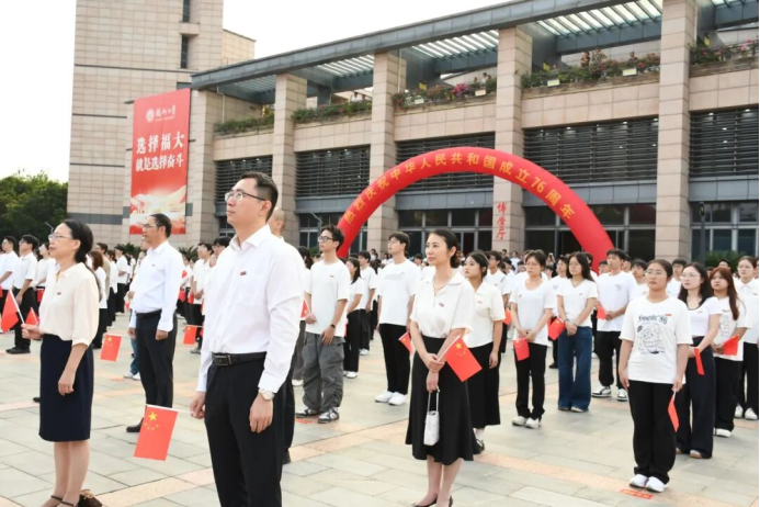 师生代表在旗山、泉港、怡山、铜盘四校区同步参与,激昂的国歌回荡校园,五星红旗迎风升起,全体人员肃立注目,把对伟大祖国繁荣昌盛、人民幸福安康的深切祝福,寄托在这面飘扬的旗帜上。