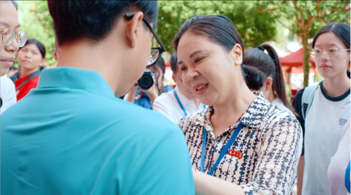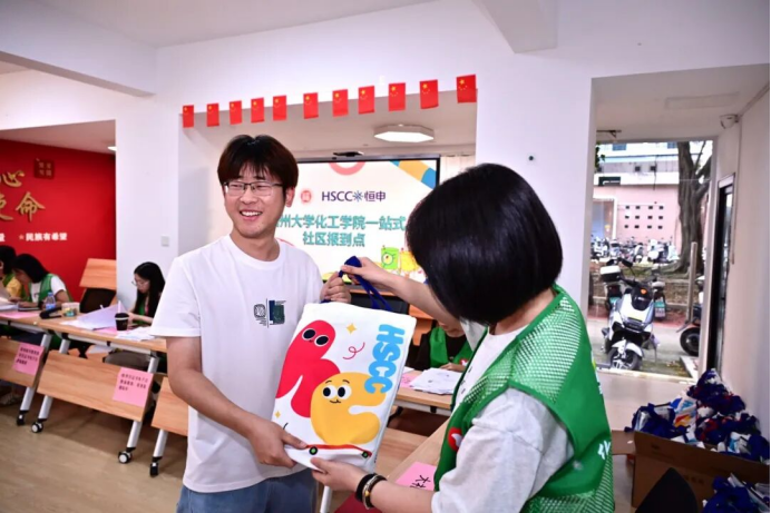 为化工新生代表佩戴福大校徽