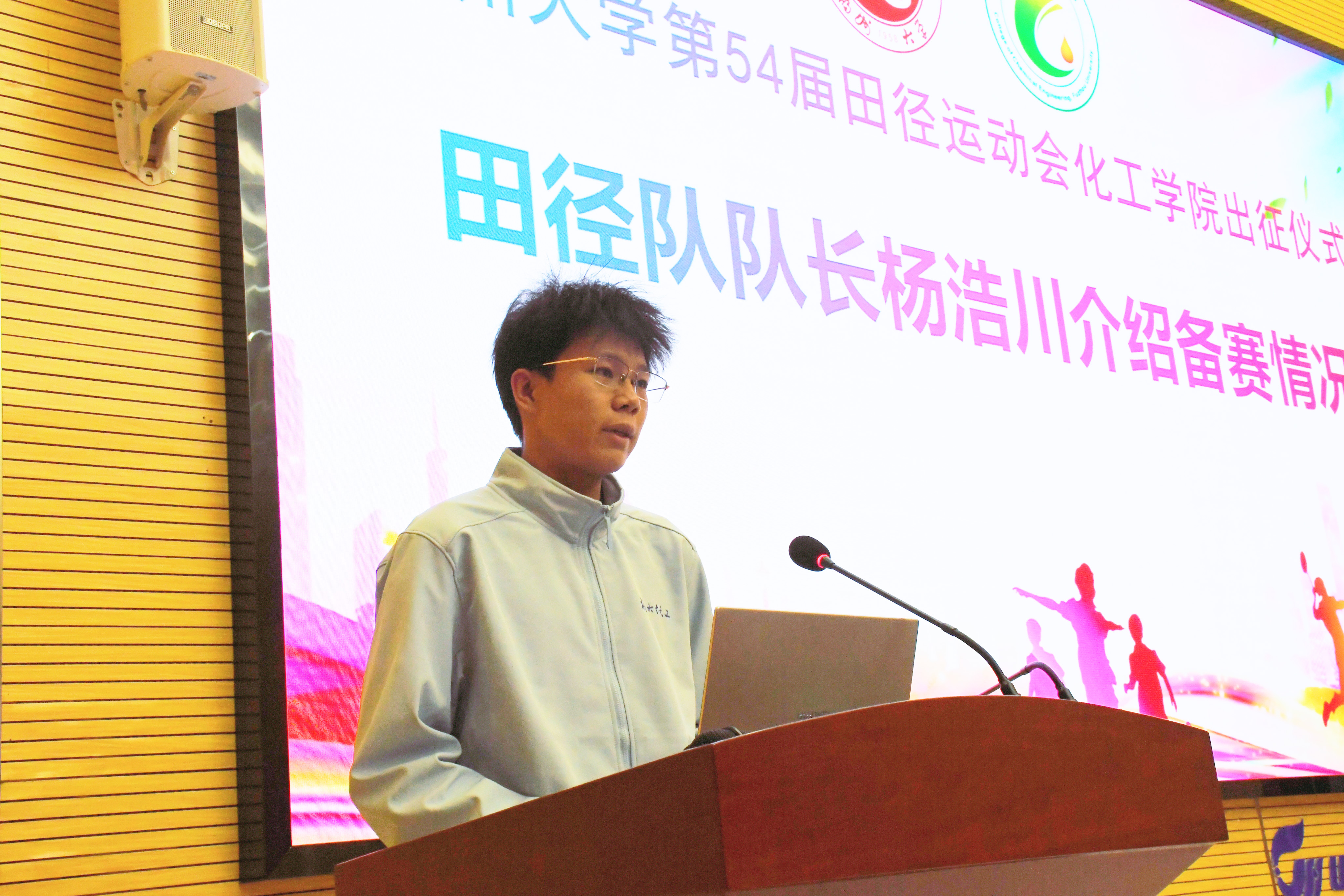 何杰老师回顾了过去十年学院在运动会的成绩并发布新的学院男女组个人得分榜,希望全体运动员能够以得分榜上的优秀运动员为榜样,努力训练,敢于突破,将“青春化工人,为荣誉而战”的精神代代传递。同时何杰老师结合自己学生时代多年的参赛经历和在田径场的成长轨迹,勉励大家调整好状态,用饱满的热情,昂扬的心态,在赛场上全力拼搏,续写化工辉煌。