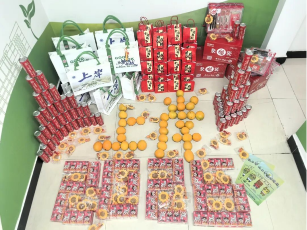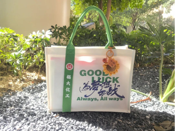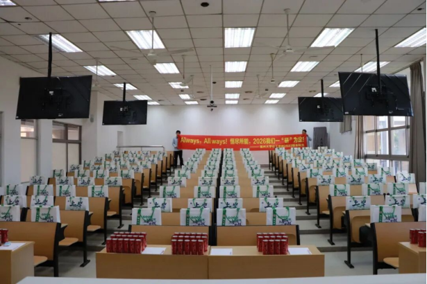 礼包内的每一份物品都承载着美好寓意:印有“成功上岸”的恒申联名定制帆布袋、写有“金榜题名、前程似锦”的零食袋、为每位考研同学定制专属姓名的“一战成硕”可乐、象征“一举夺魁”的向日葵钥匙扣,以及“聚福”文具袋、“好运旺旺”旺仔牛奶和“心想事橙”脐橙。这份满载心意的礼物,既为冲刺阶段的学子们送去温暖,更注入了决胜考研的坚定信心。