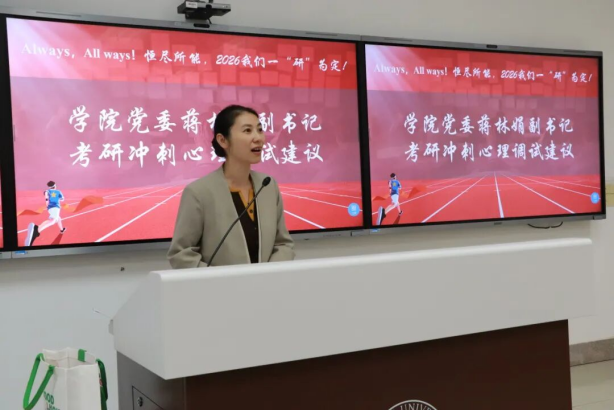 蒋林娟副书记作为国家二级心理咨询师,从考前心理调适入手,着重为同学们进行考前情绪疏导。她深入解析了考研压力产生的来源,并结合真实备考情境分享了多种有效的减压方法。蒋林娟副书记鼓励同学们学会拆解目标、接纳情绪,给自己正向的心理暗示,并提醒大家要注意生理与心理双健康。