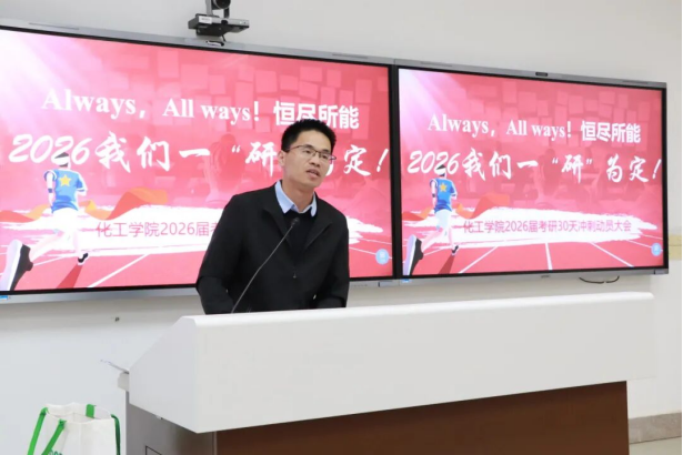 动员会上,林航书记结合化工学科发展趋势与行业人才需求,从专业成长与职业发展的双重维度,为在场学子深入阐释了考研的重要价值与时代意义。针对最后30天的备考关键期,林航书记着重强调了“信心”、“节奏”、“重点”和“坚持”四大核心关键词。他叮嘱学子们,要坚定考研必胜的信念,充分相信自身长期积累的知识储备,以积极心态直面备考压力,以“咬定青山不放松”的决心全力迎战考试,为迈向更高层次的学术舞台筑牢根基。