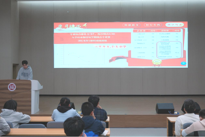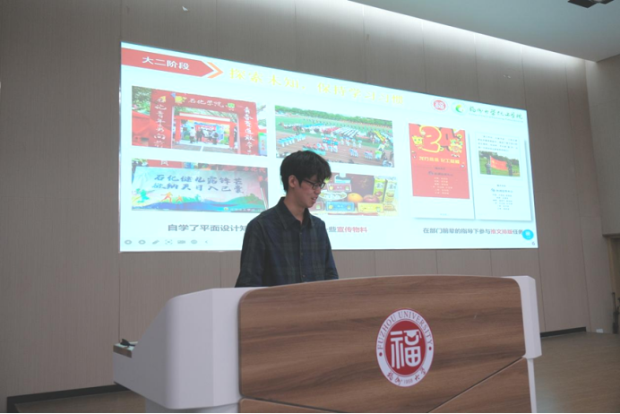 来自2023级油气储运工程专业林晨旭曾获得第十六届全国大学生数学竞赛一等奖、福建省大学生创新大赛(2025)银奖,三次参与“三下乡”社会实践。他从明德修身、躬行实践、博学笃志三方面展开,强调社会实践与学科竞赛的双重价值,并以“追风赶月莫停留,平芜尽处是春山”寄语在场同学,表达对学弟学妹的深切期许。