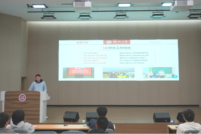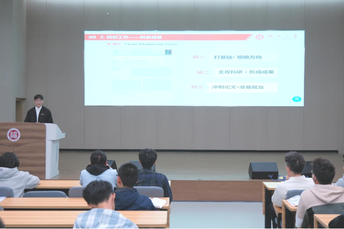 2023级化工装备与控制工程专业研究生柳翊结合自己的国奖经历和科研成果,以《行稳致远,化工逐梦》为题,分享其在化工流体微观界面特性研究方面成果,包括发表国际顶级期刊论文的科研心得。他鼓励同学们早规划、勇尝试、勤总结,努力成为“有温度、有责任感”的新时代青年。