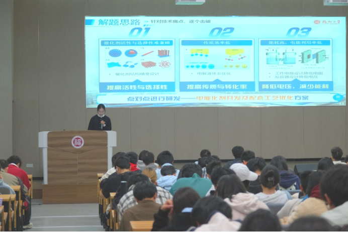 2024级化学工程与工艺专业研究生黄昀壄曾带领团队荣获第十四届“挑战杯”秦创原中国大学生创业计划竞赛金奖、2022年中国国际大学生创新大赛金奖等多项荣誉。她引用习近平总书记“青年是创新的重要生力军”寄语,结合自身在高端电子化学品领域的探索经历,勉励同学们在创新道路上平衡学业、保持积极心态、注重团队协作并勇于面对挫折。