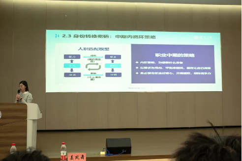 如何绘制属于自己的职业发展地图?姜经理通过纪录片《人生七年》中“西蒙的一生”等生动案例,解析了四种职业发展曲线,揭示了平台、价值与认知对路径的塑造。她重点阐述了“人职匹配模型”,指出理想的职业状态在于“成功线”(能力与岗位要求匹配)与“幸福线”(需求与岗位回馈契合)的动态平衡。结合化工专业学生入职后的真实场景分析,她让抽象理论落地,使同学们深刻理解了提前规划对避免未来职场不适配与内耗的重要意义。