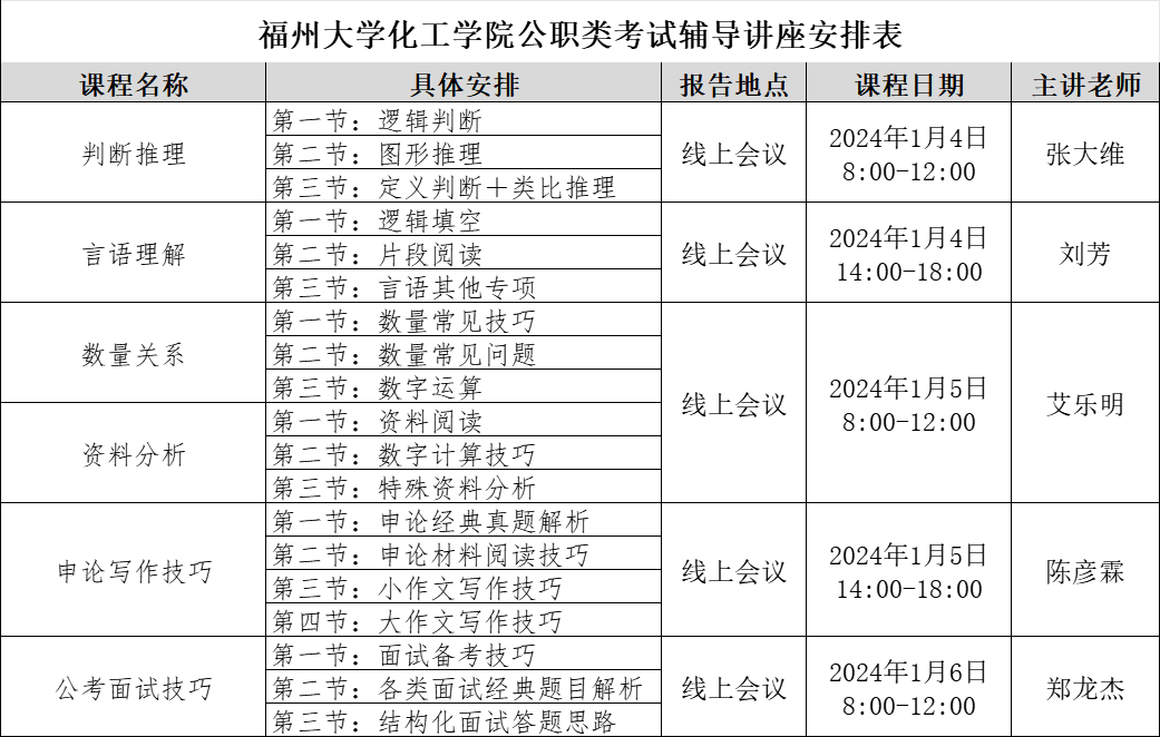 学院将开展公职类考试辅导讲座,请各年级考公学生积极参加。详细安排如下表,会议ID另行通知。