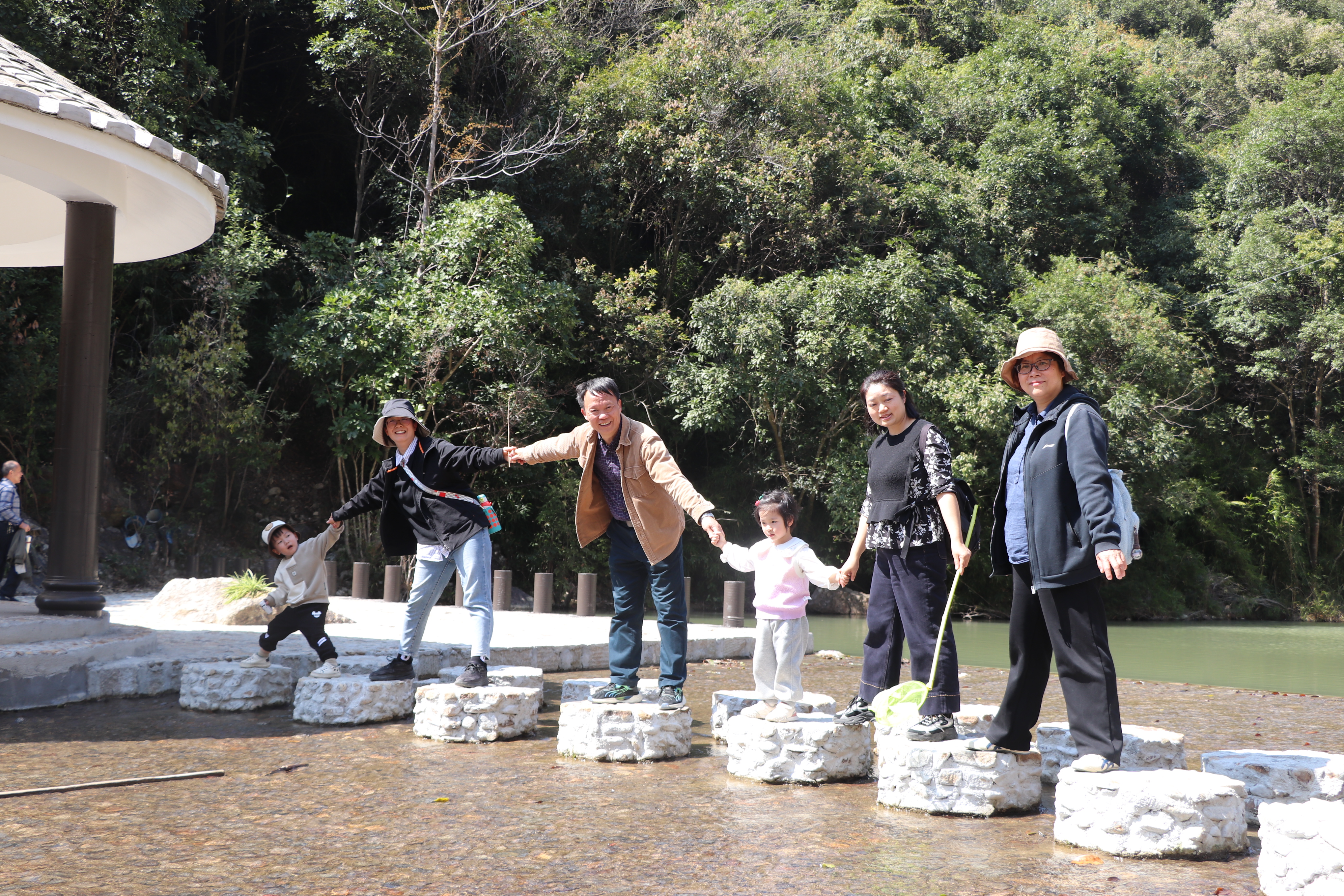 经过中午简单休整后,大家来到了贝里蟹谷景区,进行景区映入眼帘的是一大片天然池塘,阳光下池面波光粼粼,池塘四周山峦秀美,滴绿溢翠。在池塘周边用大石块堆砌出的亭榭步道,吸引老师们驻足嬉戏。