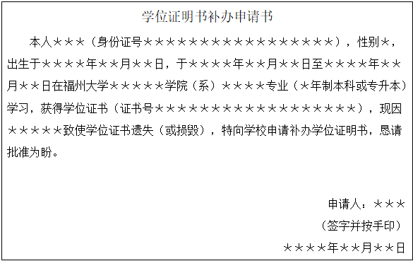 取得正式学籍的77级以后毕业生,因学位证书遗失或损毁等原因,均可向学校申请,经学校审查核准后,补发给学位证明书。申请者可于受理后两周,联系承办单位领取学位证明书。