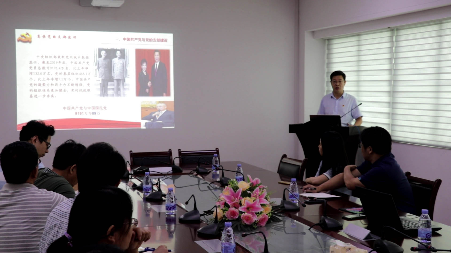 之后,学院党委施卫华书记从中国共产党支部建设、新时代高校党的支部工作要点、强化政治功能提升党支部组织力等方面作《新时代高校党的支部建设》主题党课,为中心师生阐述如何加强党支部建设以及发挥党支部主体作用。施书记的党课接地气,有生气,内容“实”,结合近期中美形势,积极切入存在的问题,顺势而“导”,引导党员全面看待问题,正确分析问题,科学解决问题,在中心师生中受到热烈欢迎。