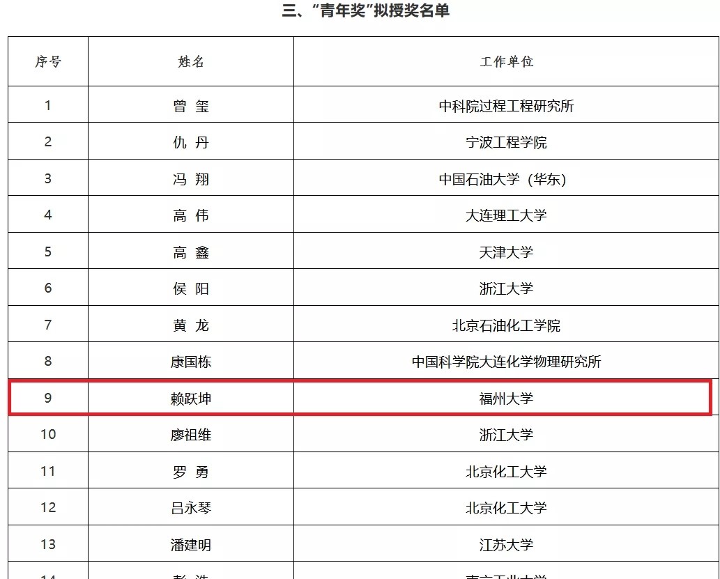 赖跃坤教授荣获侯德榜化工科学技术奖!根据《侯德榜化工科学技术奖奖励办法》的规定,中国化工学会于2020年1月启动了2020年度侯德榜化工科学技术奖的组织工作。经有关单位提名、形式审查、专家初审和会议最终评审等程序,评选出胡志海等49人拟授予侯德榜化工科学技术奖,其中成就奖5人,创新奖14人,青年奖30人。