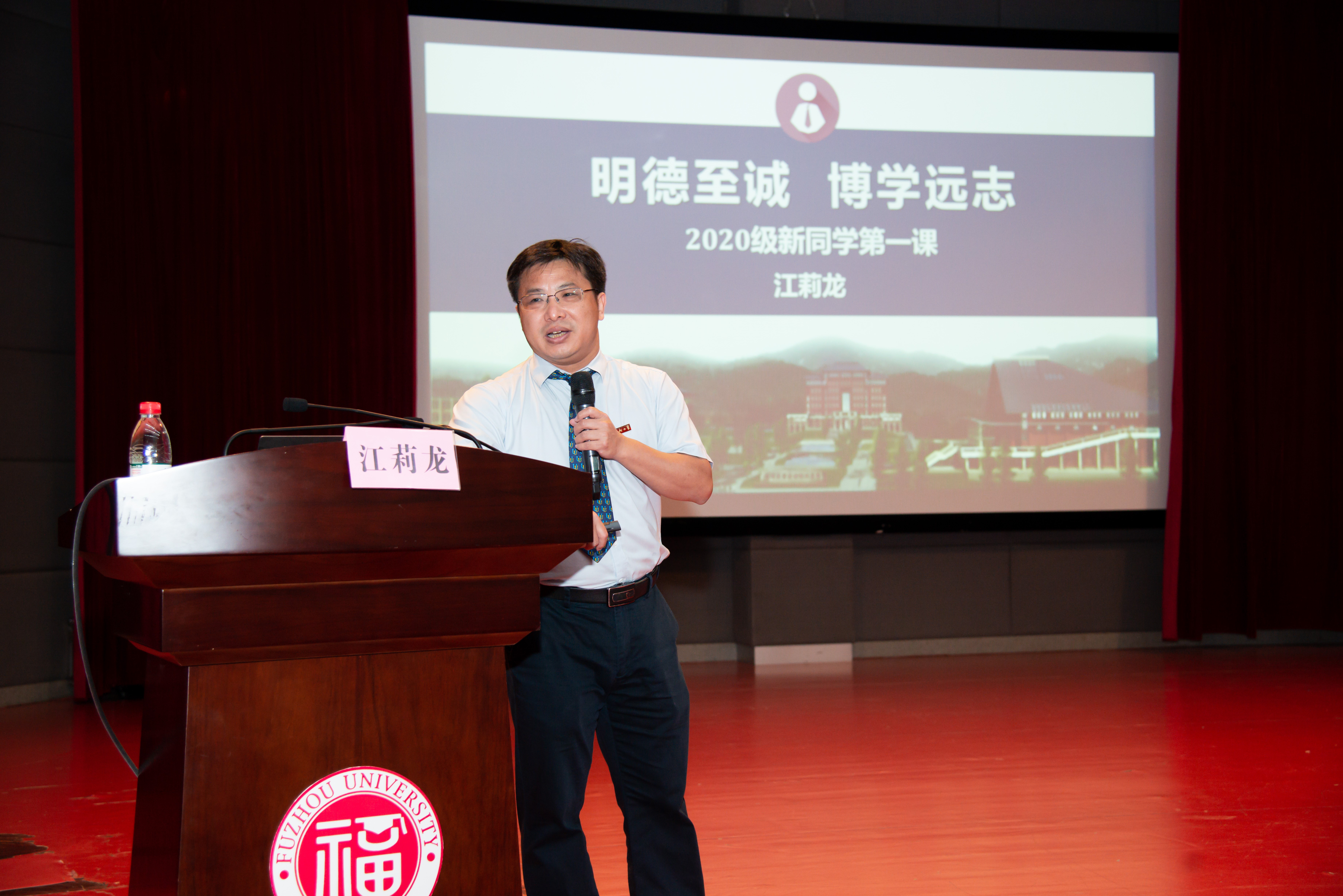 随后由院长江莉龙研究员给2020级新生带来“开学第一课”。他祝贺同学们在疫情与升学的双重压力下,都交出令人骄傲的答卷,并寄语新生与时代同心,彰显新时代石化人的精神面貌。