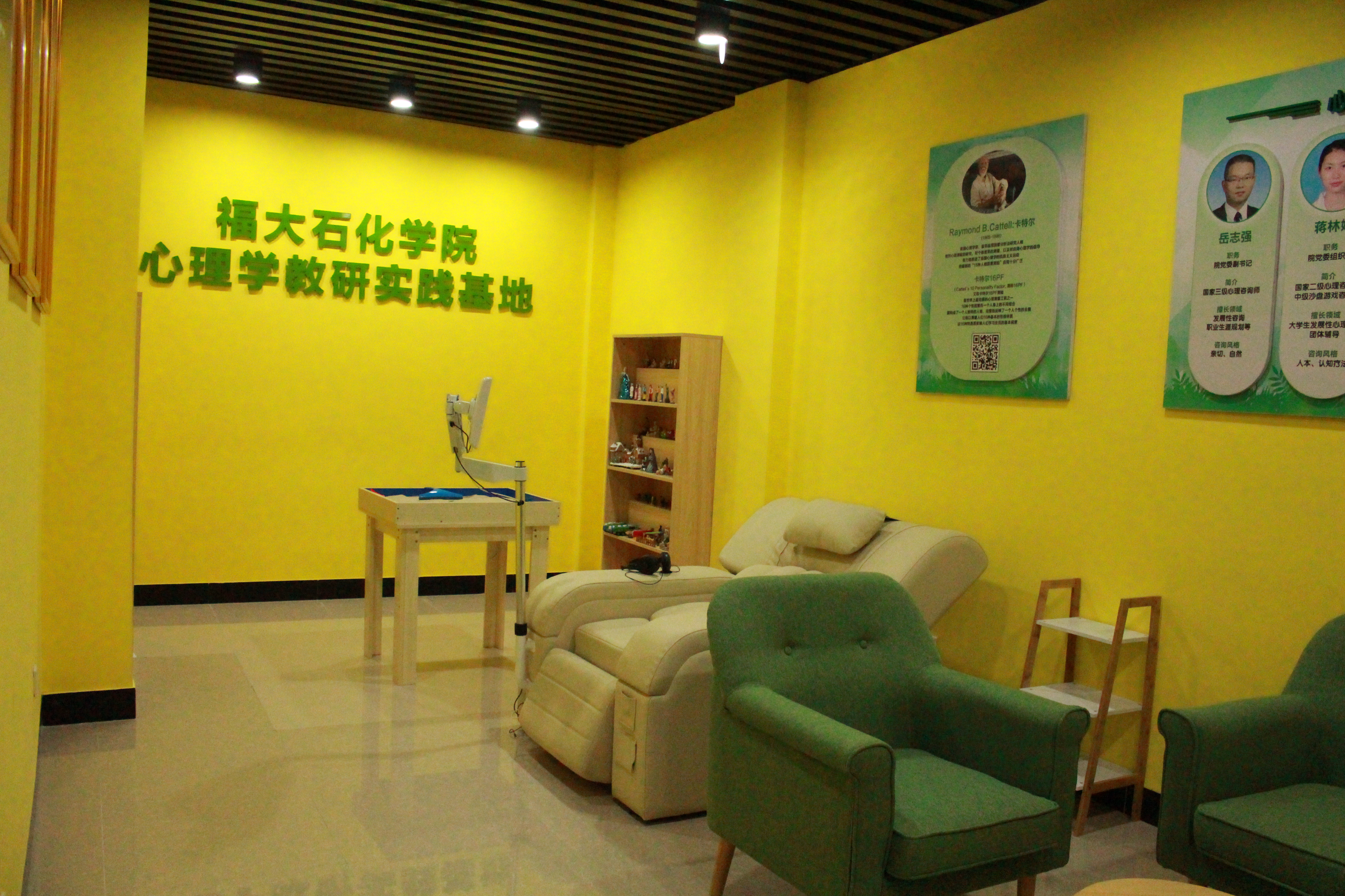 心理咨询室:内设音乐放松椅、游戏沙盘,二维码问卷答题等,通过各种专门设计的放松行为、心理专业老师辅导、问卷答题等,达到消除和缓解焦虑、紧张等不良情绪,消除心理障碍,恢复或增进心理健康。