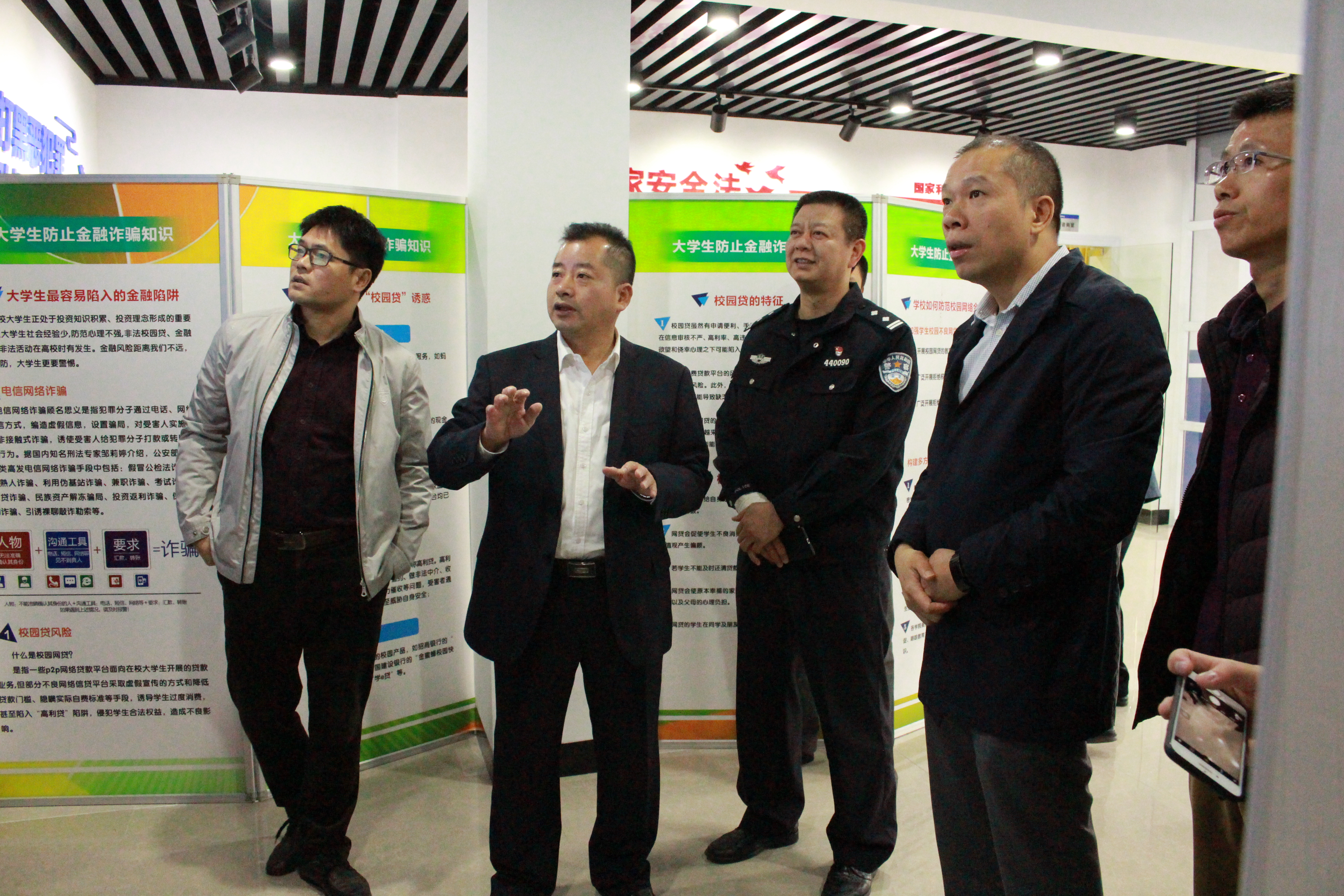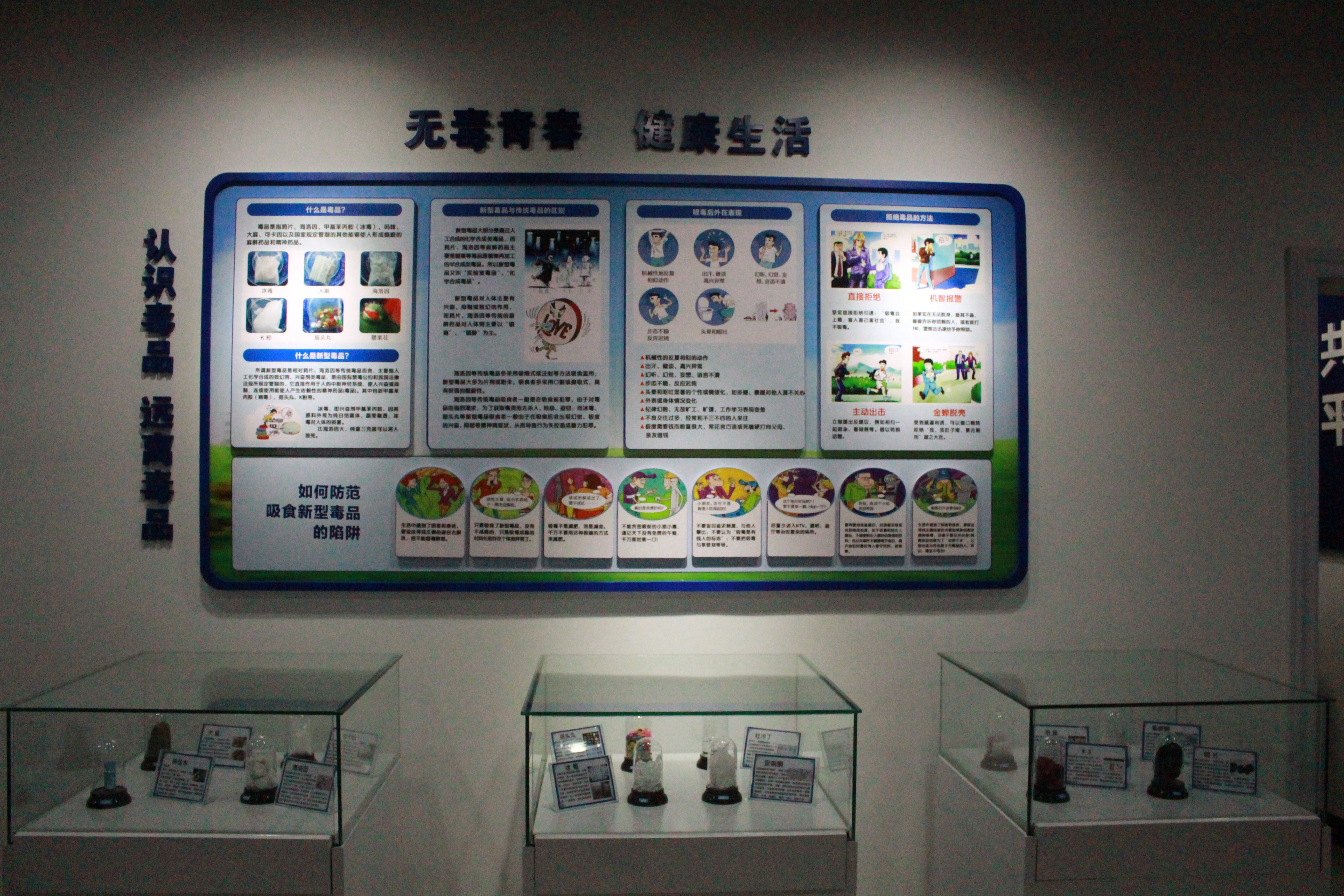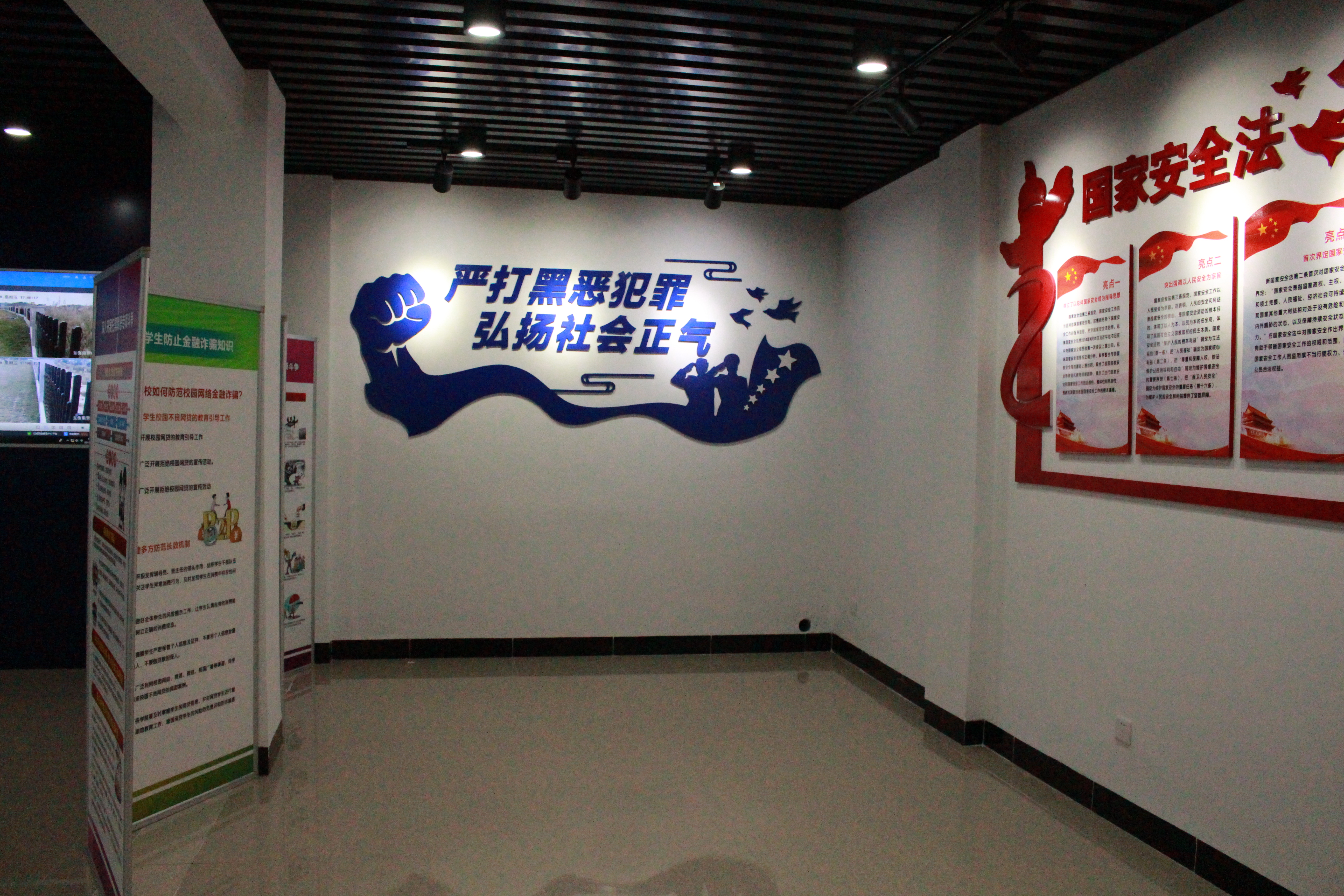 展览区:内设扫黑除恶宣传板块、《国家安全法》板块、校园贷宣传板块、禁毒宣传板块、毒品展示柜、宣传教育视频。旨在让学生提高“识黑、辩黑”的能力,积极拥护《国家安全法》,认清校园贷的危害,防范毒品危害、拒绝毒品。每个月可根据学校不同宣传主题,更换宣传内容。