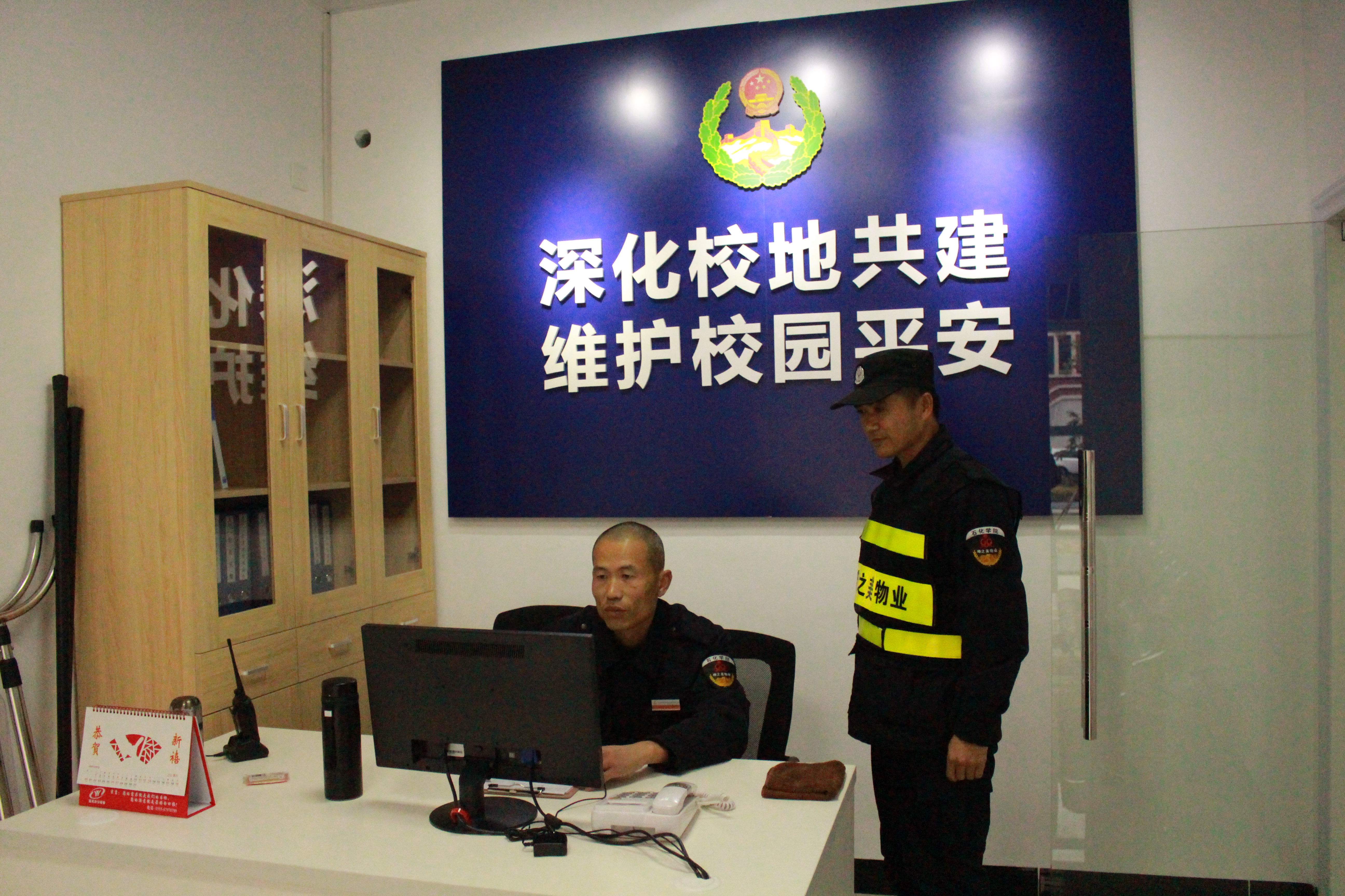 执勤室:包含石化学院保卫办公室、前黄派出所石化学院警务室。入住石化学院保卫人员、前黄派出所工作人员、前黄镇联防队员,实行“集中办公、交替巡逻”工作机制。执勤室内安装了一键报警系统和视频监控系统,可实时掌握各种治安动态及不稳定因素,第一时间处理突发事件,有效遏制违法犯罪行为的发生。