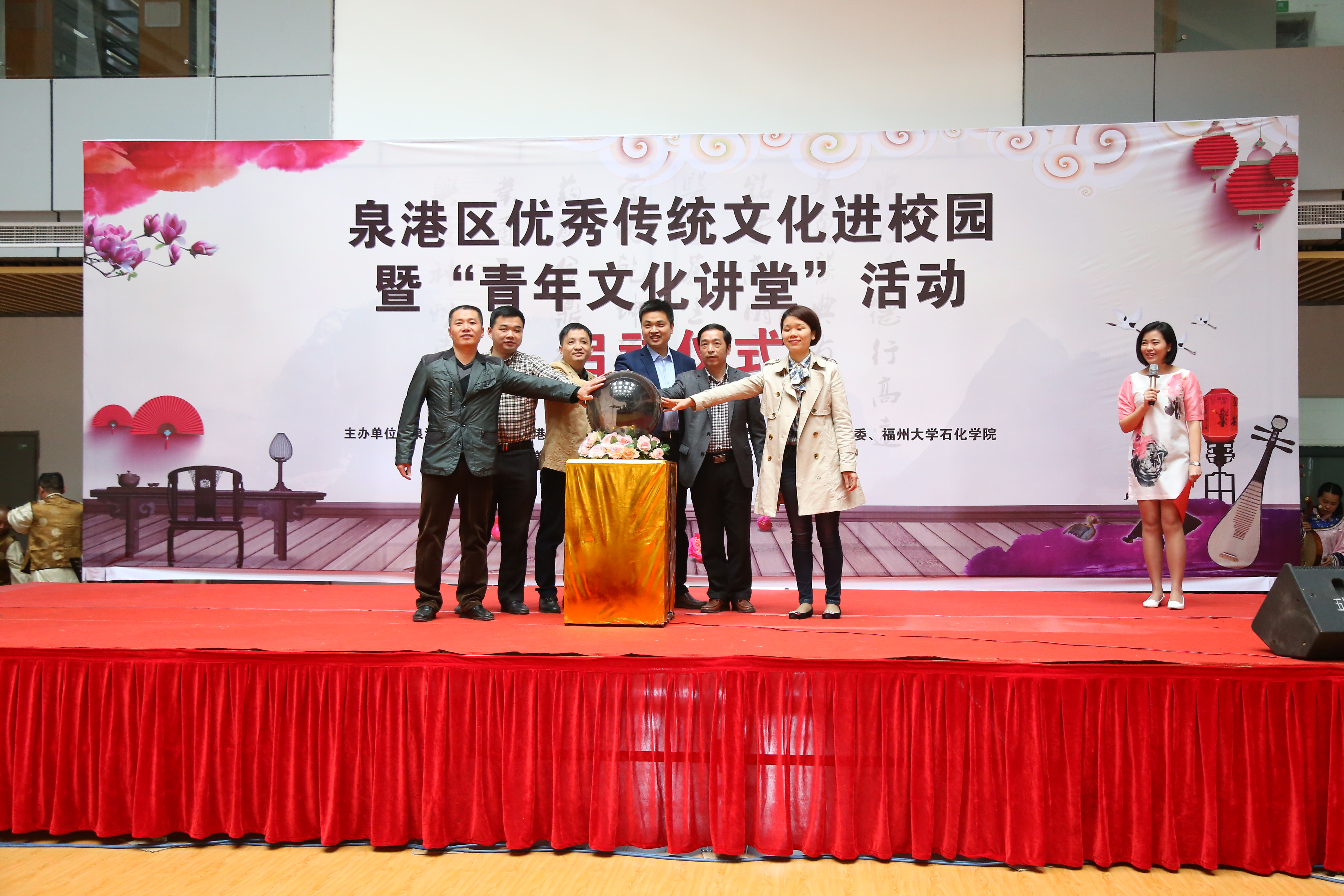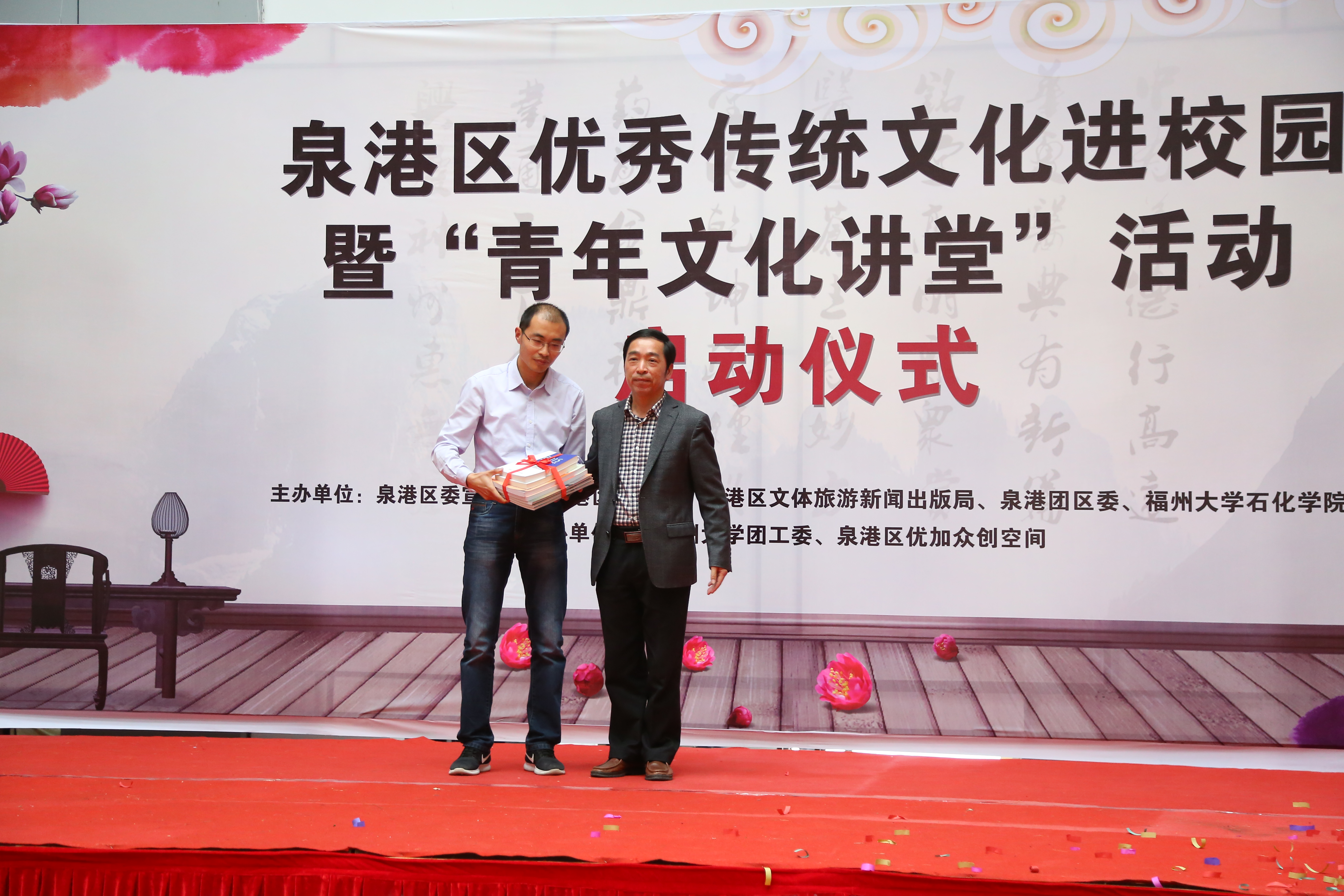 启动仪式上,学院领导与泉港区各部门领导共同启动活动的启动球,标志着本次泉港区优秀传统文化进校园暨“青年文化讲堂”活动活动的正式启动。在赠书环节,区文体新局局长陈玉顺将一批泉港区传统文化教育书籍赠送给樱花动漫