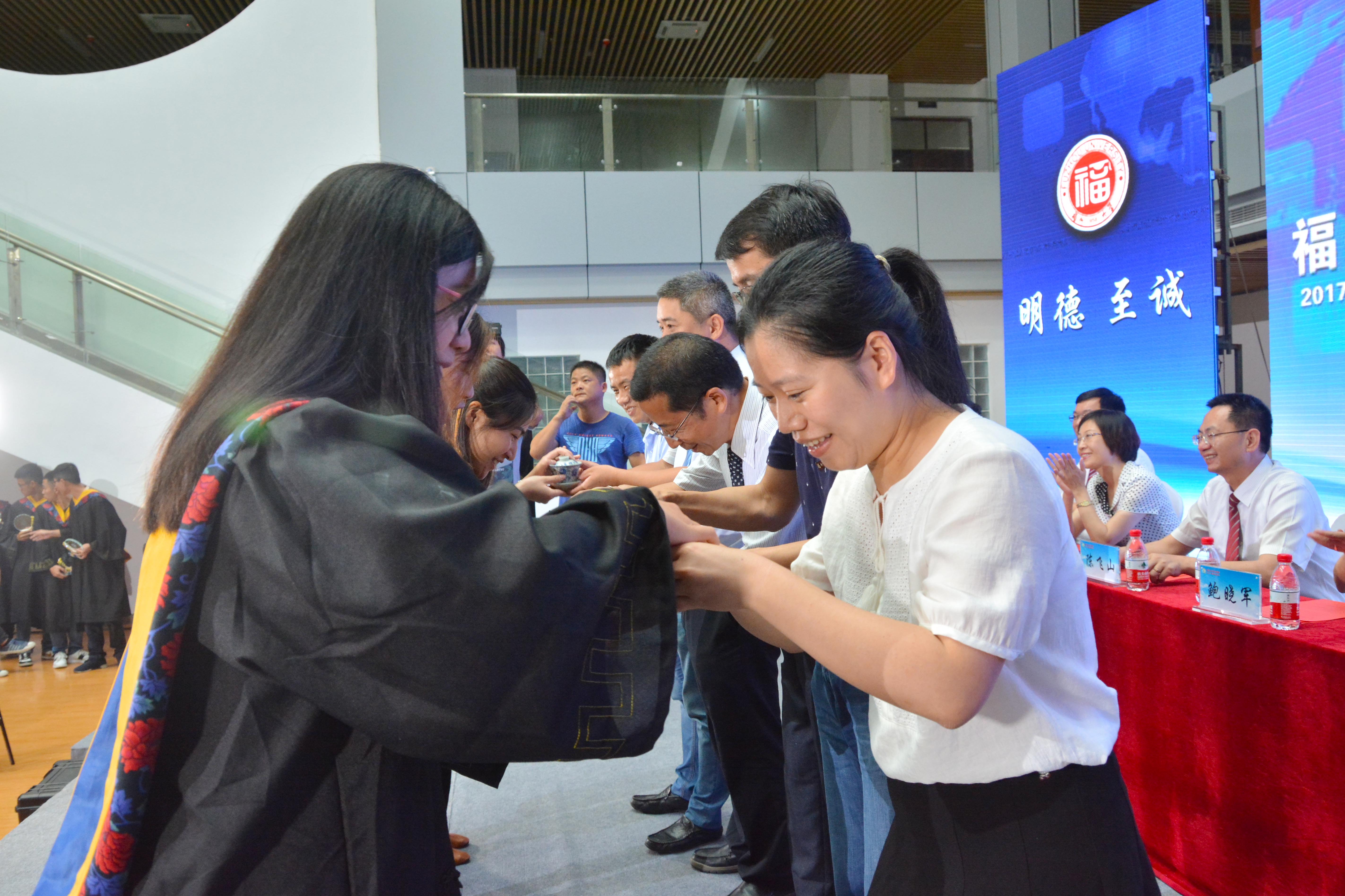 随后毕业生代表宣读2017届毕业生推荐的“我心目中的好老师”名单。饱含着对老师无尽的感恩之情,毕业生代表们为到场的好老师代表敬献谢师茶、送上奖杯,并用深深的三鞠躬表达了全体同学对老师们的感谢。