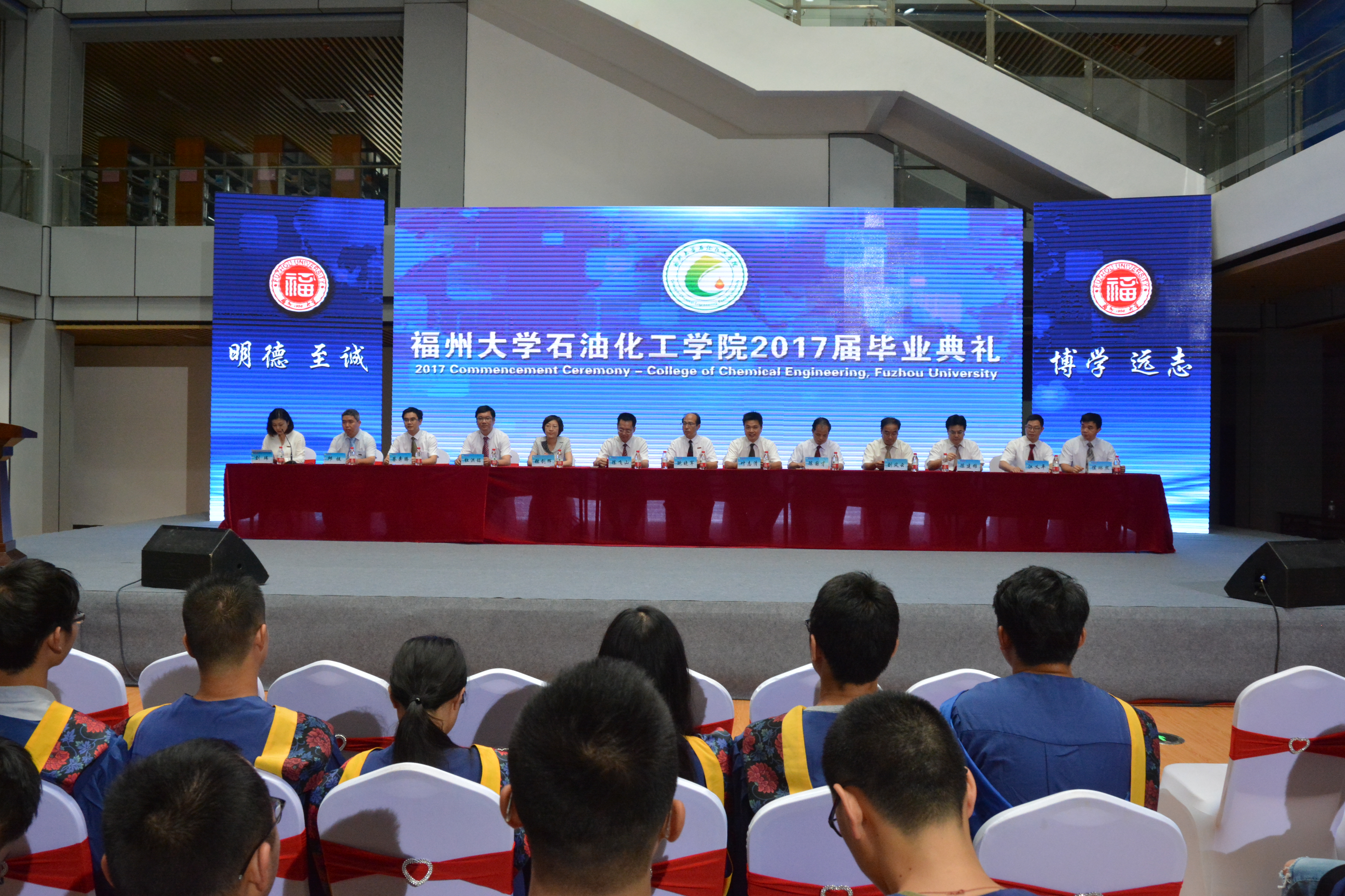 理事会副理事长陈国才先生、泉港石化工业园区管委会副主任张剑辉女士、中化泉惠园区副总经理刘风云先生、福建石化集团公司人事教育部(老干处)主任杜洪铭先生、院长鲍晓军教授、院党委书记叶志清副教授、副院长邱挺教授、副院长江义平高级工程师、副院长侯琳熙教授等领导与学院老师、部分毕业生家长,以及全体2017届本科、硕士、博士毕业生欢聚一堂,共同见证2017届毕业生的美好时刻。毕业典礼由院党委刘玮副书记主持。