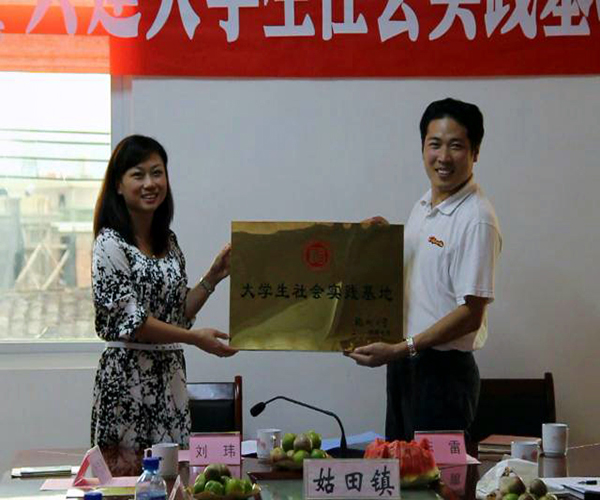 大学生社会实践基地”铜牌。暑期社会实践队队长、学生代表于琳珠汇报了本次社会实践主要内容。