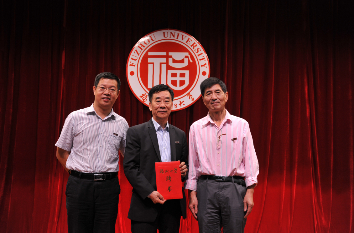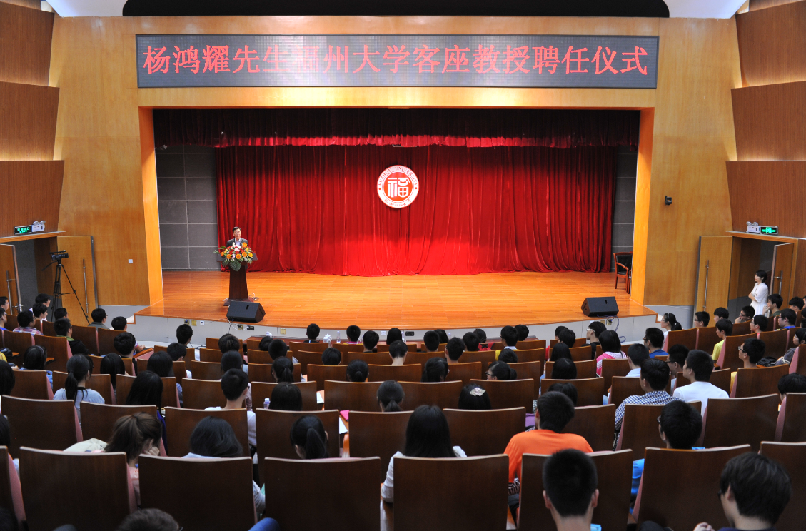 客座教授聘书,为杨鸿耀先生佩戴校徽,并合影留恋。