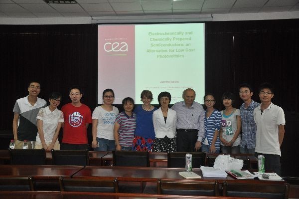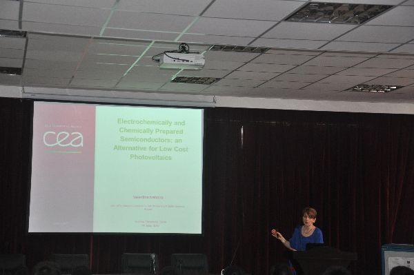 法国国家微电子研究中心的Valentina Ivanova研究员做了题为“Electrochemically and Chemically Prepared Semiconduction:an Alternative for Low Cost Photovoltaics”的精彩报告,她介绍了通过电沉积和连续离子层吸附反应(SILAR)技术如何制备最新型的太阳能电池,她的团体已经研究了如何在电沉积的氧化锌纳米线上吸附多种量子点材料(如CdS, CdTe CuInS2 and Cu2ZnSnS4 (CZTS)),而后组装成了新型的太阳能电池。报告后,许多同学们积极提问,Valentina Ivanova博士都详细对其进行一一解答。