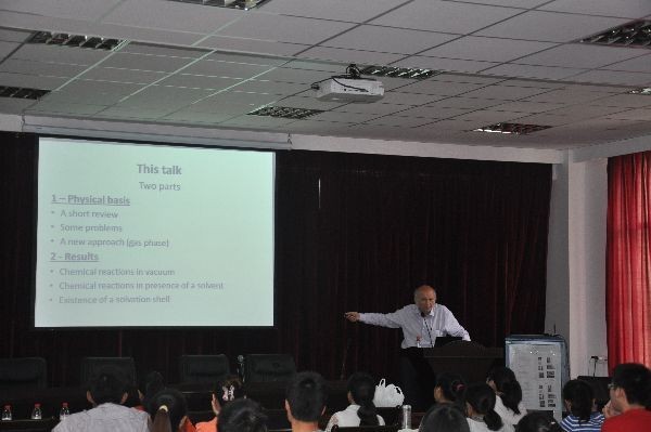 随后,法国国家科学研究中心的Jean Pierre Badiali教授做了题为“The Chemical Rate Constant.A new theoretical approach.”的报告,Badiali教授作为一名理论物理科学家,他介绍了如何通过理论计算的方法研究不可逆反应中的化学反应速率常数,如何进一步讨论电化学反应的活化能中的溶剂效应和电位的影响对反应速率常数的影响。Badiali教授力求从理论观点,尽可能接近实际反应,通过简单的模型来深入理解基础理论。通过Badiali教授细心讲解,现场师生均表示受益匪浅。