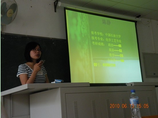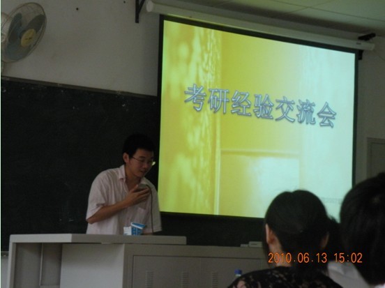 2007级考研经验交流会在化学化工实验教学中心南楼301举行,刚参加毕业答辩即将离校的06级化学、化工、制药、过控的考研前辈们应邀出席了此次经验交流会。他们都是今年一月份的研究生入学考试的佼佼者,并成功获得了复旦大学、厦门大学、中国石油大学、华东理工大学、华南理工大学的录取通知书。