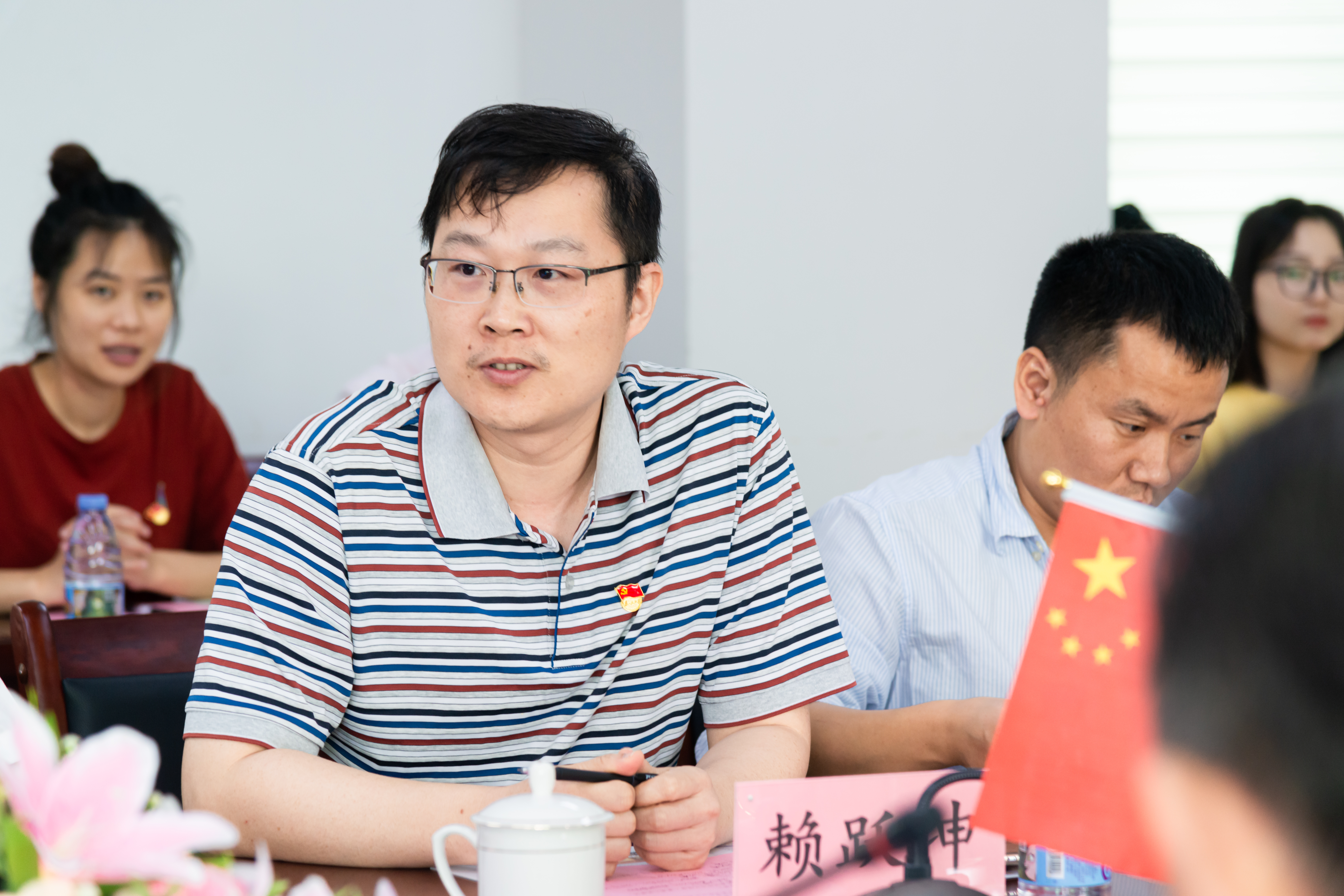 第四位是“80后”支部书记代表赖跃坤老师分享。赖跃坤老师回忆起当初入党的情景。南斯拉夫大使馆事件的触动,让他怀着一颗强烈的报国心,递交入党申请书,并立志学成专业知识,为祖国建设添砖加瓦。加入中国共产党后,自己个人事业也随着祖国的发展而发展。他感慨的说“中国在2001加入WTO、申奥成功,让我深深的明白,祖国现代化建设和改革大业的发展,赋予我们这些80后青年的崇高使命。”