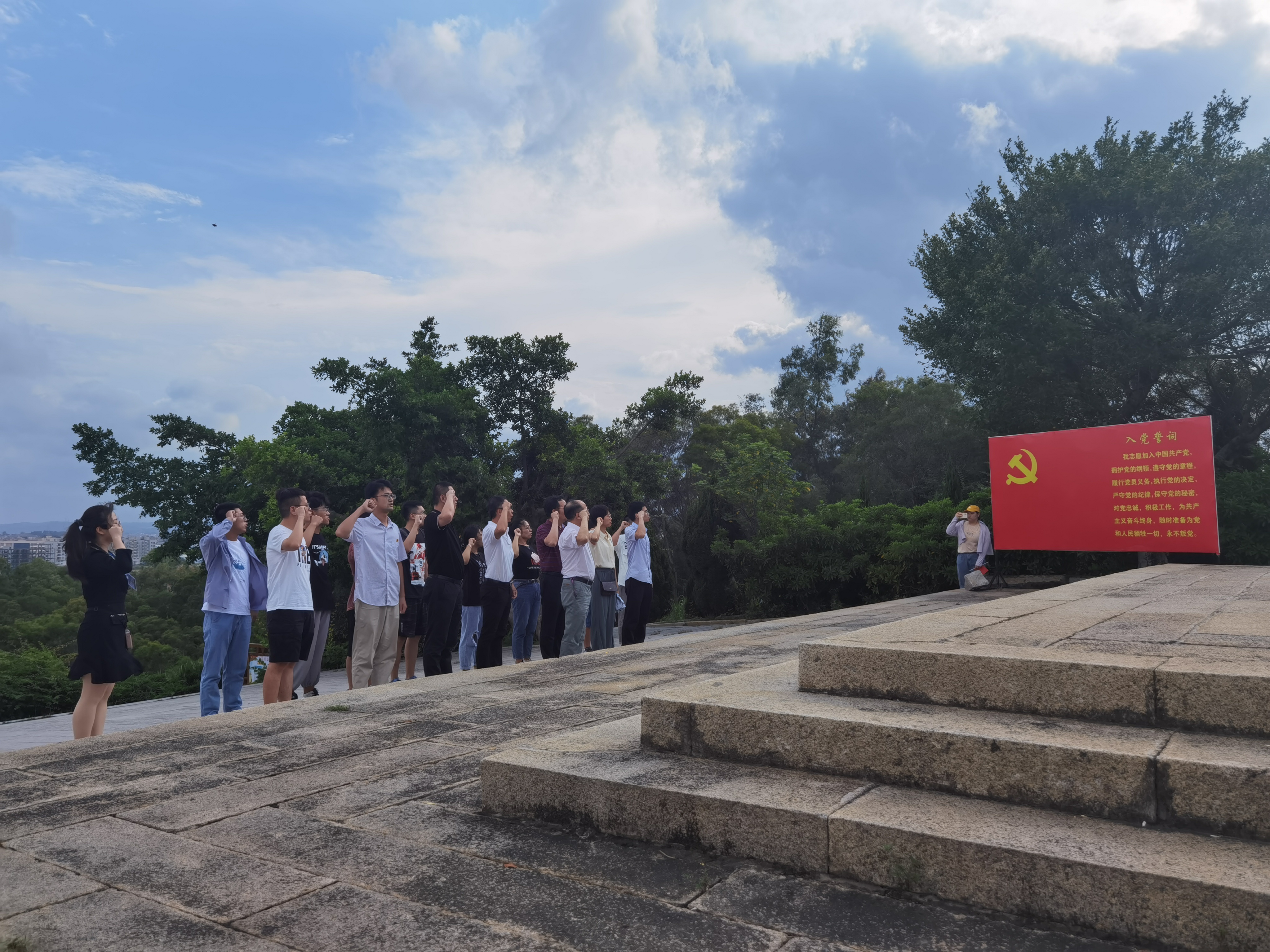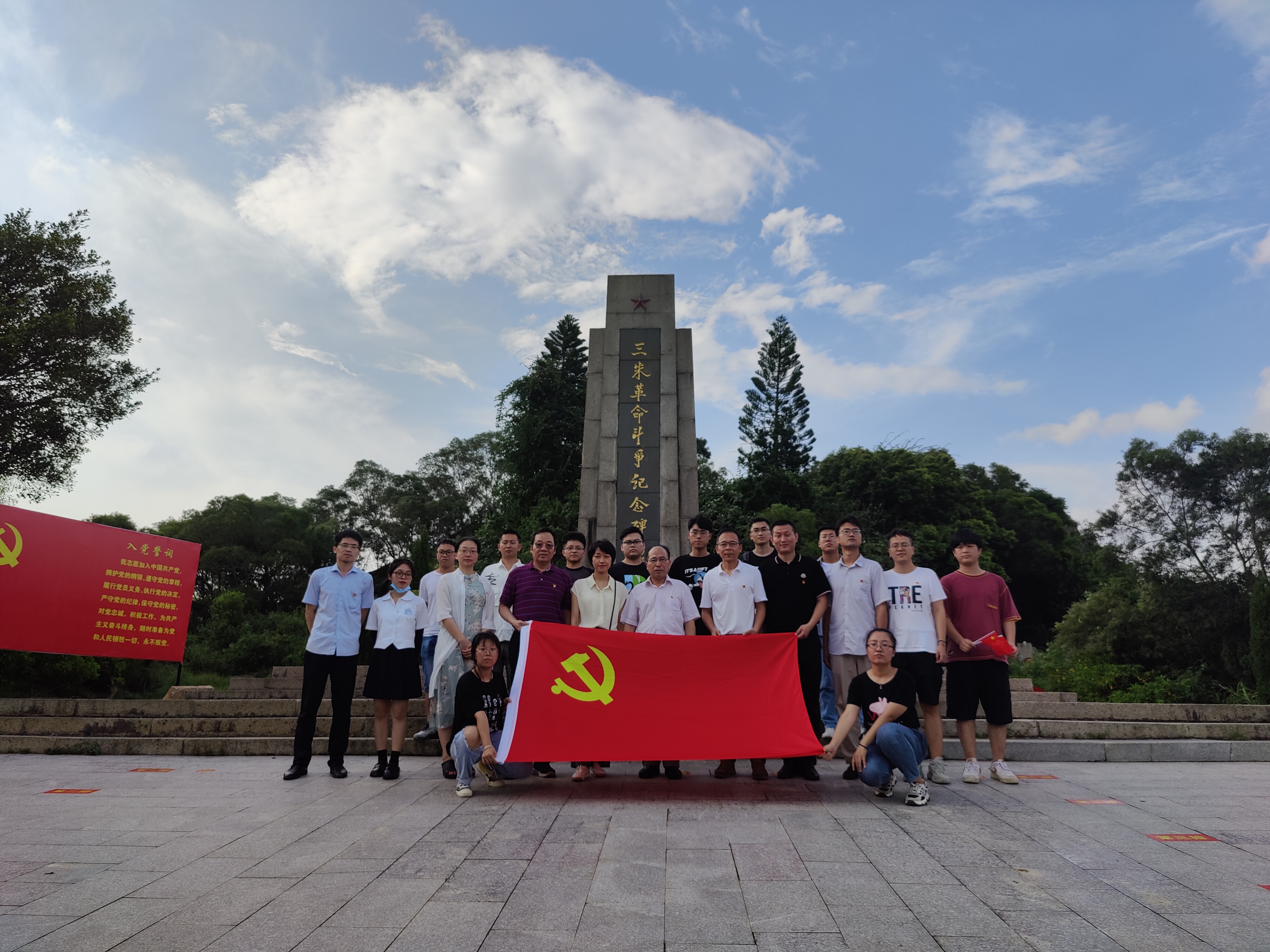 “我志愿加入中国共产党……”,在领誓人清源创新实验室执行主任鲍晓军同志的带领下,全体同志面朝党旗,高举右拳,在三朱革命斗争纪念碑前重温入党誓词,铮铮誓言,铿锵有力。