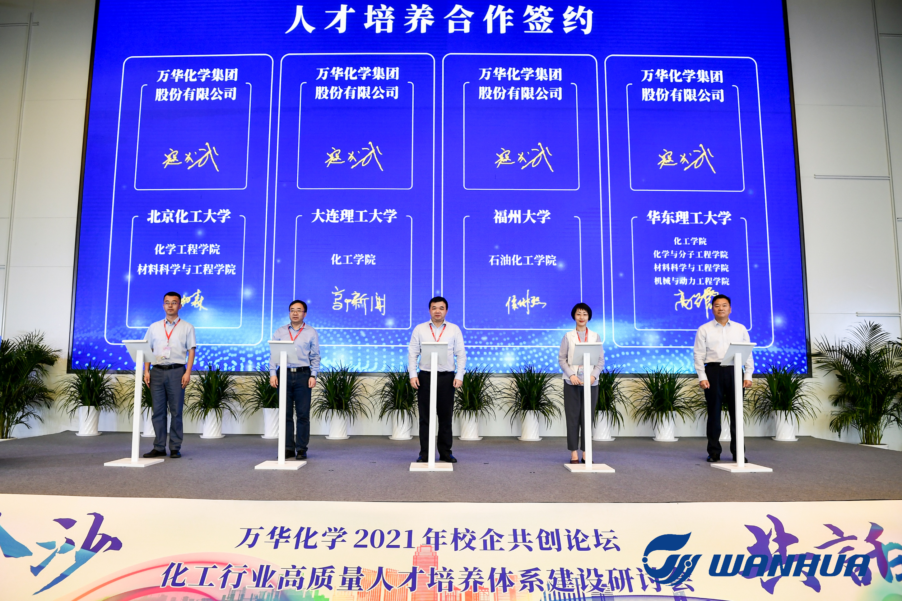 与万华化学现场签订人才培养合作协议。现场有天津大学、浙江大学、四川大学、中南大学、北京化工大学等共计12家高校签订了人才培养合作协议