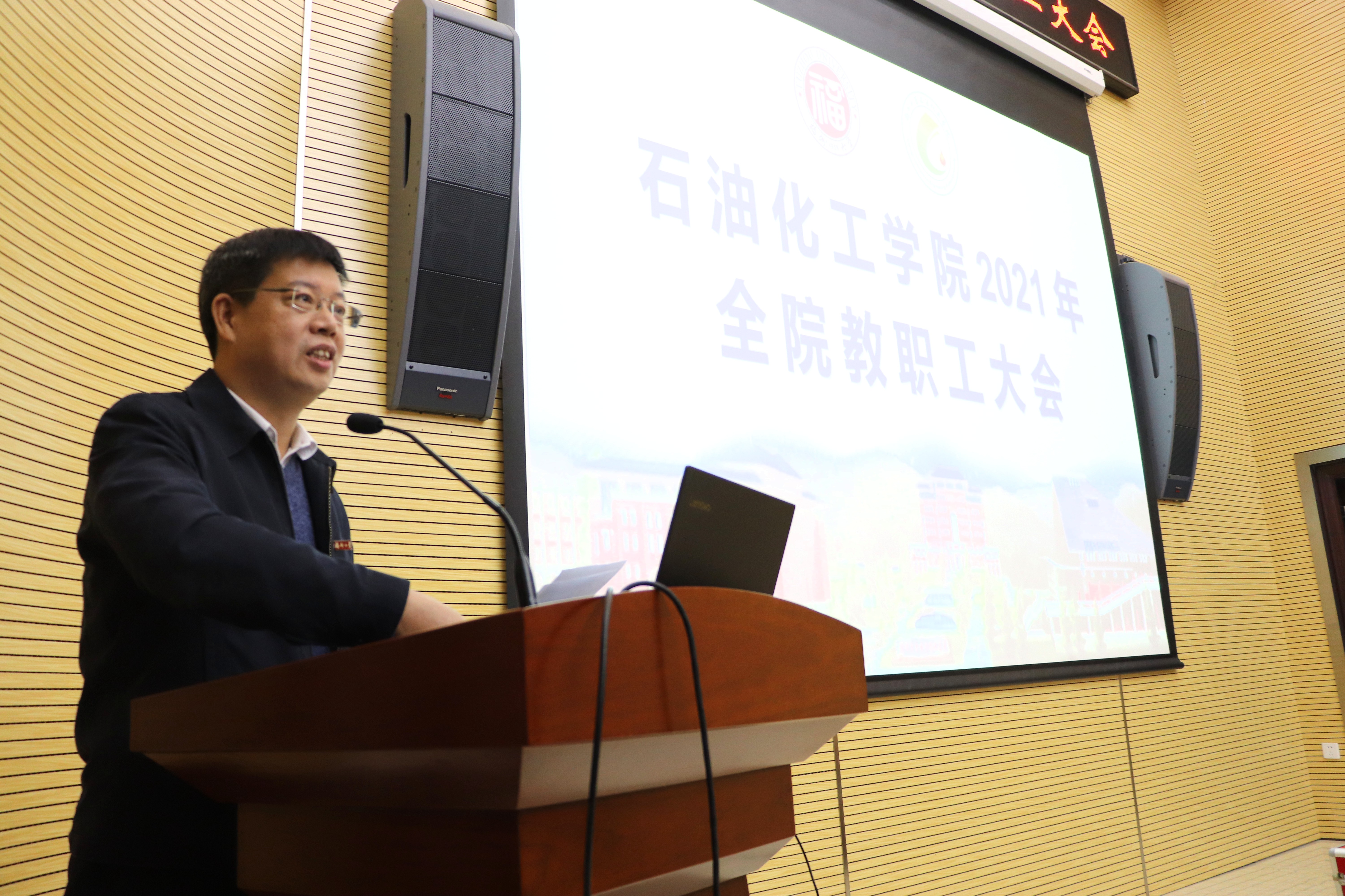 在旗山校区泉港楼优尔报告厅召开全院教职工大会,进行学院班子年度工作述职和处级干部工作述职,并布置学院期末及寒假工作,会议由院党委书记施卫华主持。