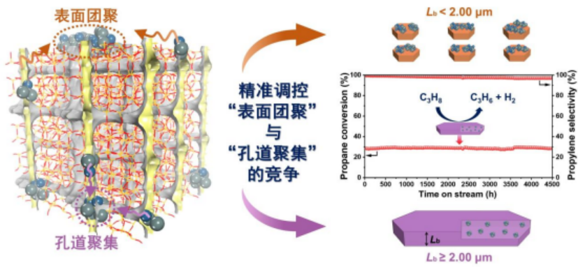 该研究团队发现,将铂粒子封装在MFI分子筛的孔道中能在短期内抑制其烧结失活;而在长期的反应中铂粒子将缓慢从分子筛孔内扩散到外表面发生聚集,导致不可逆的失活。因而,避免铂失活的根本途径是防止其扩散至分子筛外表面。团队进一步研究发现,铂粒子的稳定性取决于MFI分子筛b轴长度。当b轴长度小于2微米时,铂粒子因扩散路径较短迅速迁移到催化剂外表面,进而发生不受限的聚集形成大颗粒,导致催化剂不可逆失活;当b轴长度大于2微米时,扩散路径的延长致使铂粒子在分子筛孔道内发生聚集而长大,长大的铂粒子最终被孔道“卡住”并被牢固锁定,从而可有效避免铂粒子的团聚失活。基于上述发现,该团队提出通过分子筛孔道限域实现铂粒子的“扩散-聚集-自锁”,创制出具有抗烧结性能的超稳定性丙烷脱氢铂催化剂。
