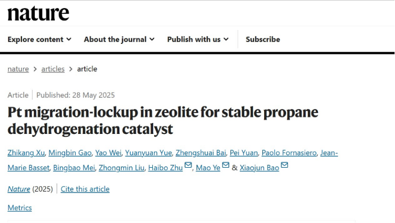 鲍晓军、朱海波教授团队在丙烷脱氢铂基催化剂领域经过长达8年的持续攻关,取得了系统性突破。两个月内先后在国际顶刊Science和Nature上发表研究论文,分别解决了铂基催化剂无氯氧化再生与反应稳定性两大挑战。
