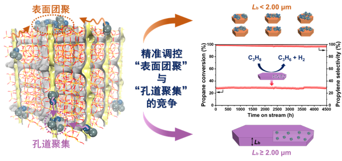 该研究团队发现,将铂粒子封装在MFI分子筛的孔道中能在短期内抑制其烧结失活;而在长期的反应中铂粒子将缓慢从分子筛孔内扩散到外表面发生聚集,导致不可逆的失活。因而,避免铂失活的根本途径是防止其扩散至分子筛外表面。团队进一步研究发现,铂粒子的稳定性取决于MFI分子筛b轴长度。当b轴长度小于2微米时,铂粒子因扩散路径较短迅速迁移到催化剂外表面,进而发生不受限的聚集形成大颗粒,导致催化剂不可逆失活;当b轴长度大于2微米时,扩散路径的延长致使铂粒子在分子筛孔道内发生聚集而长大,长大的铂粒子最终被孔道“卡住”并被牢固锁定,从而可有效避免铂粒子的团聚失活。基于上述发现,该团队提出通过分子筛孔道限域实现铂粒子的“扩散-聚集-自锁”,创制出具有抗烧结性能的超稳定性丙烷脱氢铂催化剂。
