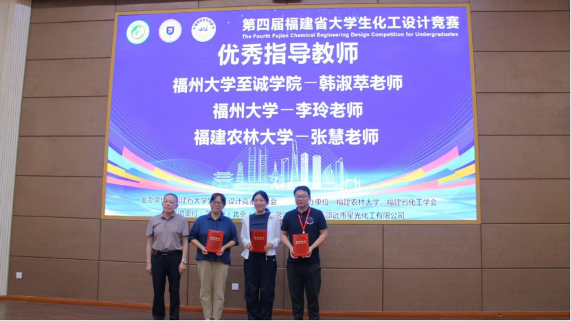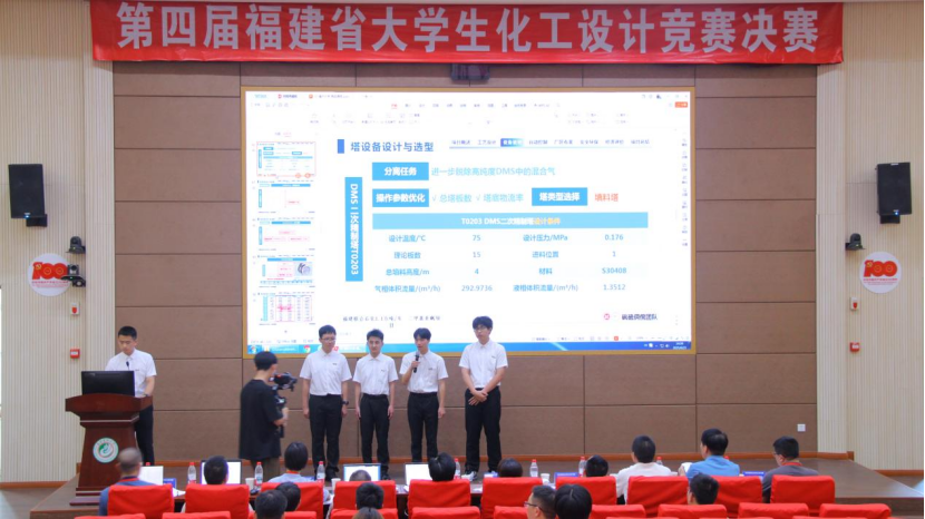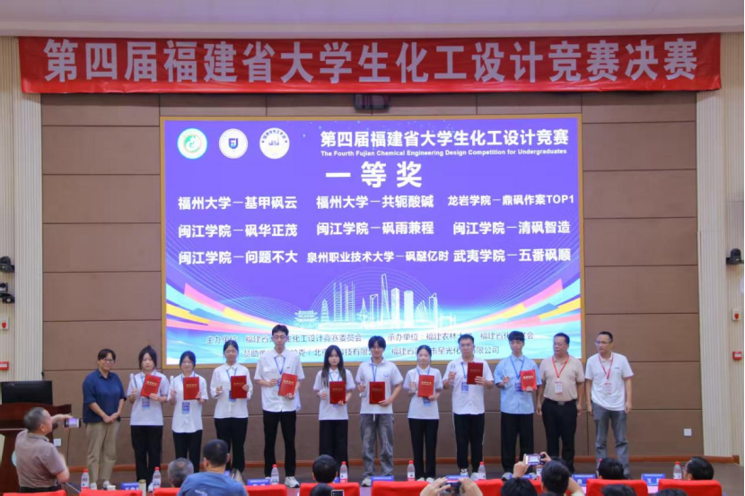 决赛现场,由15名化工学子组成的砜硫倜傥队、基甲砜云队和共轭酸碱队,凭借扎实的专业知识、创新的工程思维和出色的现场表现,赢得了评委的高度认可。由李玲、蔡国辉、张孟佳老师指导的“砜硫倜傥队”以《福建联合石油化工有限公司年产1.1万吨二甲基亚砜生产项目》夺得赛事特等奖(银奖)。由刘杰、吴丹、范立海老师指导的“基甲砜云队”以《宁东宝丰能源集团股份有限公司双氧水氧化法年产0.5万吨电子级二甲基亚砜项目》获评一等奖。由李玲、蔡国辉、王晓达老师指导的“共轭酸碱队”以《中化泉州石化1.2万吨/年清洁生产二甲基亚砜项目》获评一等奖。