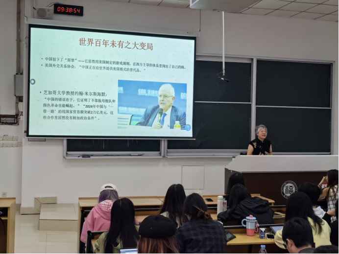 马克思主义学院舒展教授主讲《全球视域下的社会主义现代化强国梦》。她围绕现代化强国的国际标准、时代背景与中国式现代化的实现路径,结合二十大报告与二十届四中全会精神,深入阐释科技强国、经济强国等重大命题,引导学员树立全球视野,增强服务国家和平发展道路的使命感。