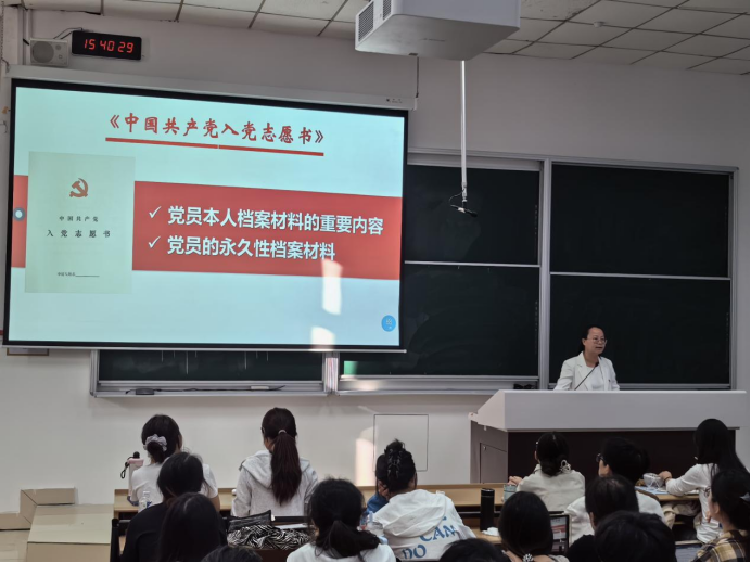 校党委组织部赵艳莉副教授主讲《如何正确填写〈中国共产党入党志愿书〉》。她结合典型案例,强调入党是个人政治生命的起点,要求学员结合成长经历与理论认识,严肃认真地表达入党动机与决心,体现对党的忠诚。