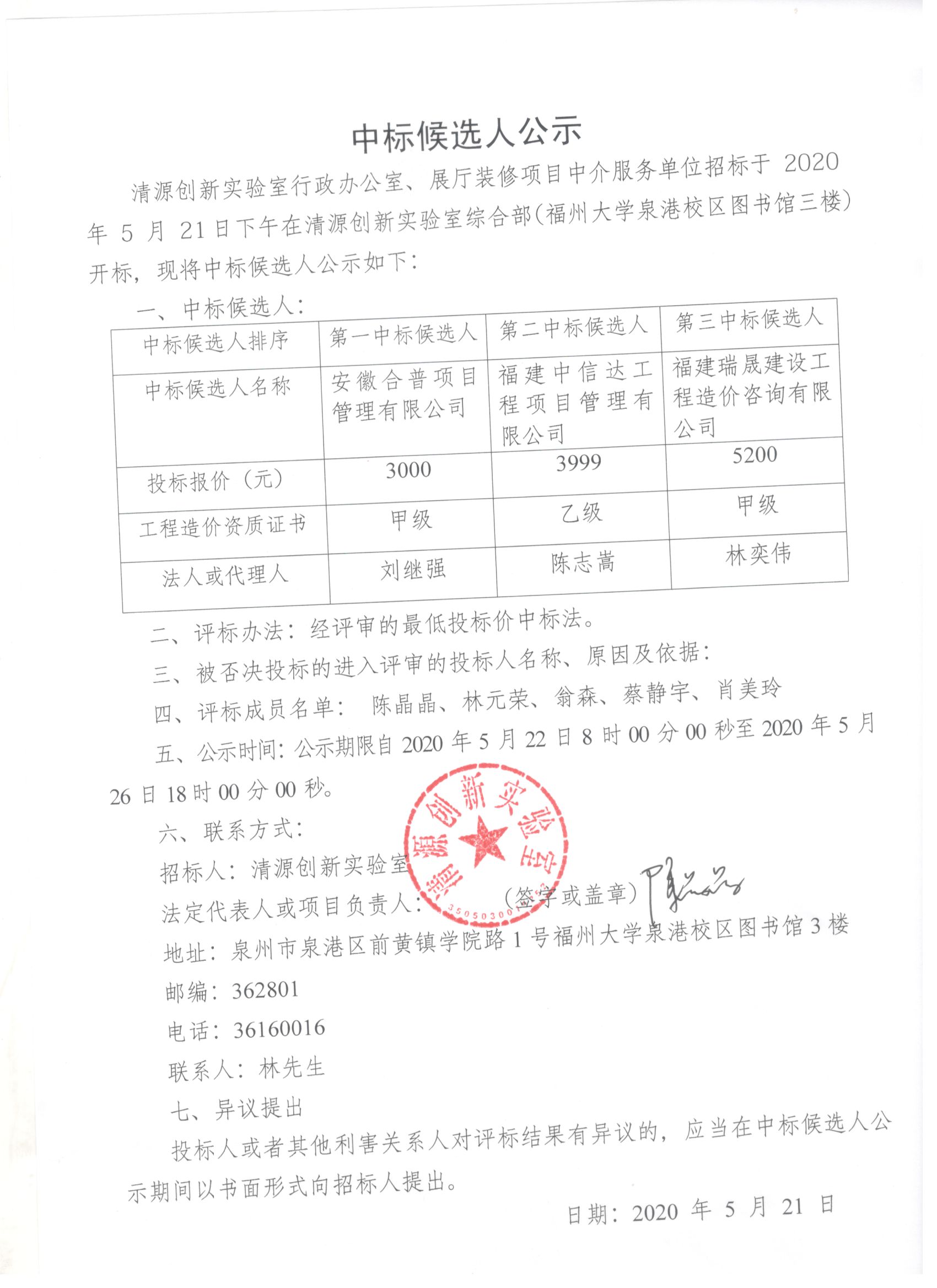 受清源创新实验室委托,于学院网站发布《关于清源创新实验室行政办公室、展厅装修项目中介服务单位招标中标候选人公示》,公示结果由清源创新实验室全权负责解释。