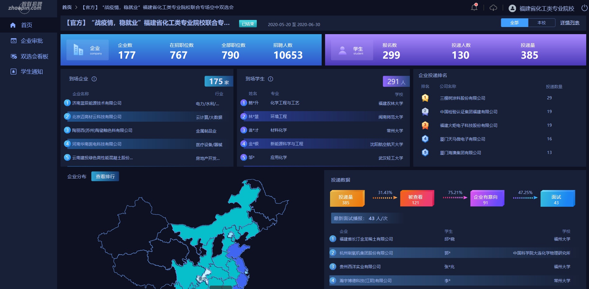 率先联合智联招聘网启动空中双选会,牵头开展福建省化工行业八校联合专场空中宣讲会,保障疫情期间毕业生就业不掉线。